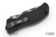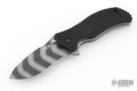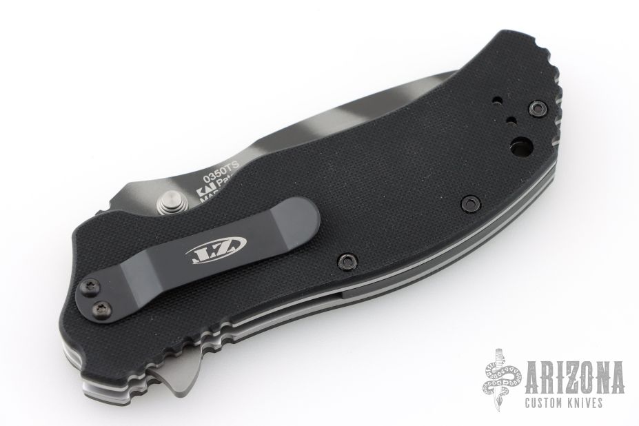This 0350TS liner lock flipper is a Ken Onion design executed by Zero Tolerance and features a recurved spear-point blade with a tiger stripe finish, stainless steel liners and black G10 scales. It also features the Speed-safe assisted opening system. The black coated steel clip is 4 way adjustable. Perfect function. Includes original box and papers. Excellent Condition.  #46499