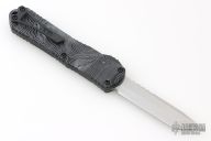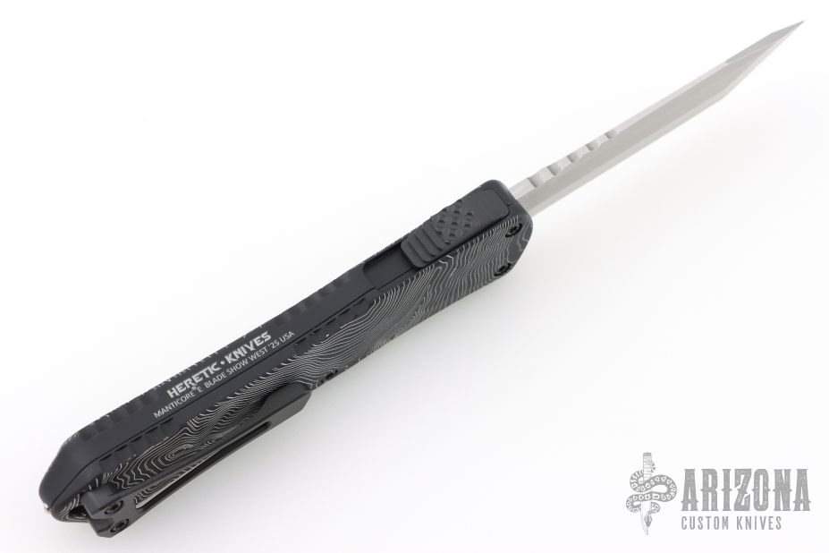 This Manticore-E by Heretic Knives features a stonewash finished tanto blade with notched thumbrest. The handle has a black laser engraved aluminum frame, black stainless steel hardware and tip down clip, and DLC titanium thumbslide. Comes with original box and card. New from maker at the 2025 Blade West!