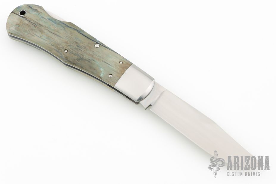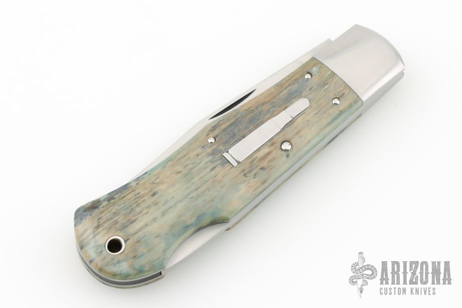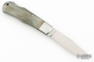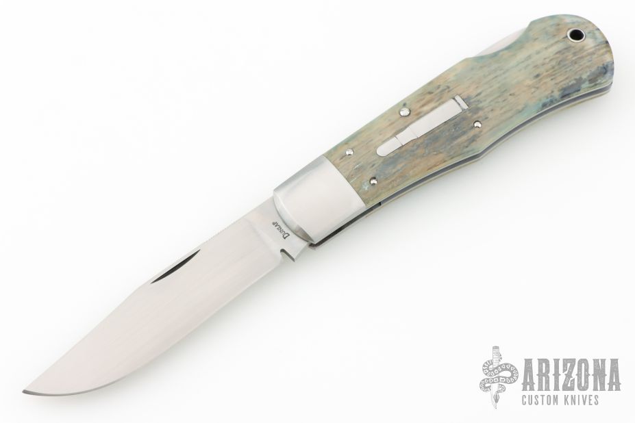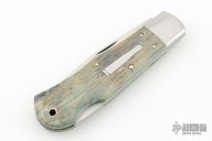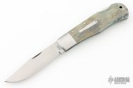 This Lockback by Jim Dunlap features a hand rub satin finished blade with nail nick and notched thumbrest. The handle has stainless steel bolsters, fossil mammoth scales with stainless steel bullet escutcheon, stainless steel liners and spring. Comes with maker's zippered case and COA. Excellent condition.