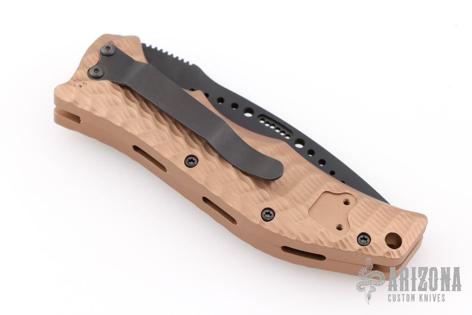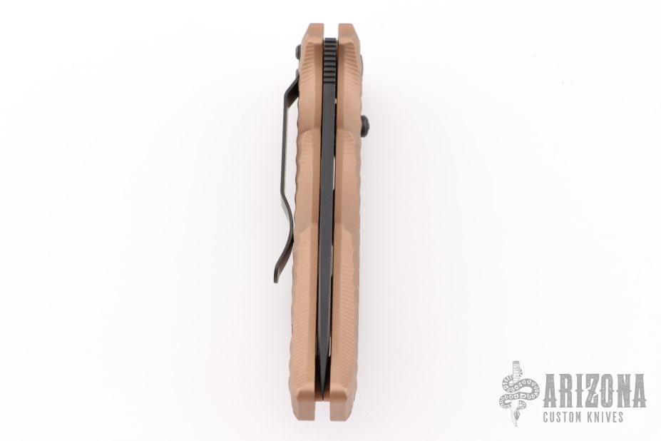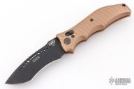 This Gun Hammer Torpedo Automatic is a Darrel Ralph Design executed by HTM Knives. It features a black recurve blade with notched thumbrest. The handle is comprised of milled flat dark earth anodized aluminum with a black coated stainless steel pocket clip that can be positioned for tip up or tip down carry. Comes with original box, zippered case and papers. Excellent condition.
