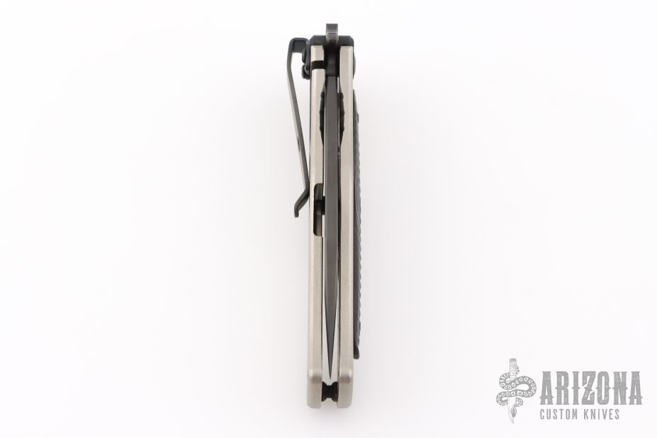 This Madd Maxx 4" Assisted Flipper is a Darrel Ralph Design executed by HTM Knifes. It features a black tanto blade with false top edge, fullers, dual thumb studs and flipper. The handle is comprised of a blasted titanium frame with carbon fiber overlay over barrel spacers. Black coated steel tip down clip and lanyard hole in pommel. Includes padded and zippered case, original box and papers. Excellent condition.