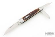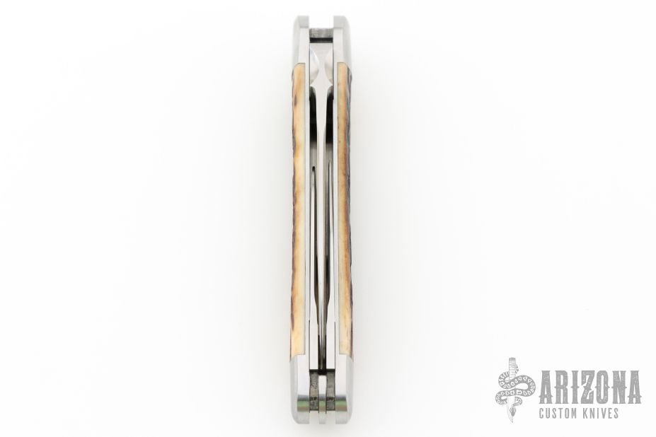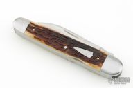 This Whittler by Bill Ruple features hand rub satin finished blades with long pull and nail nicks. The handle has stainless steel bolsters and liners (with jeweled interiors), jigged bone covers with stainless steel escutcheon, satin finished stainless steel springs. Includes maker's zipper case. New from maker at the Blade Show West!