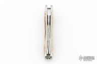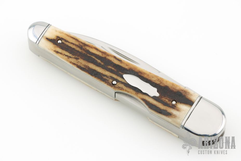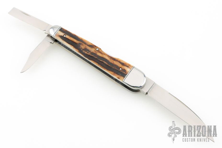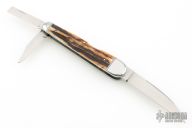 This Lockback Whittler by Tobin Hill, features a large single blade that is engaged by the lockback. The remaining two blades are slipjoints, they both have half stops and are flush in all positions. The handle has stainless steel bolsters, stag covers with a stainless steel escutcheon, stainless steel liners and springs. Includes maker's padded zippered case. New from Maker at the Blade Show West!