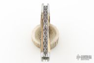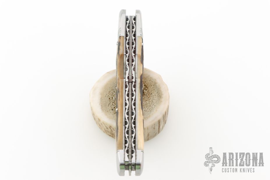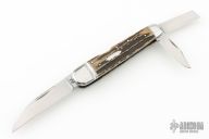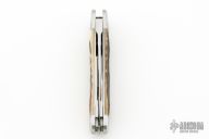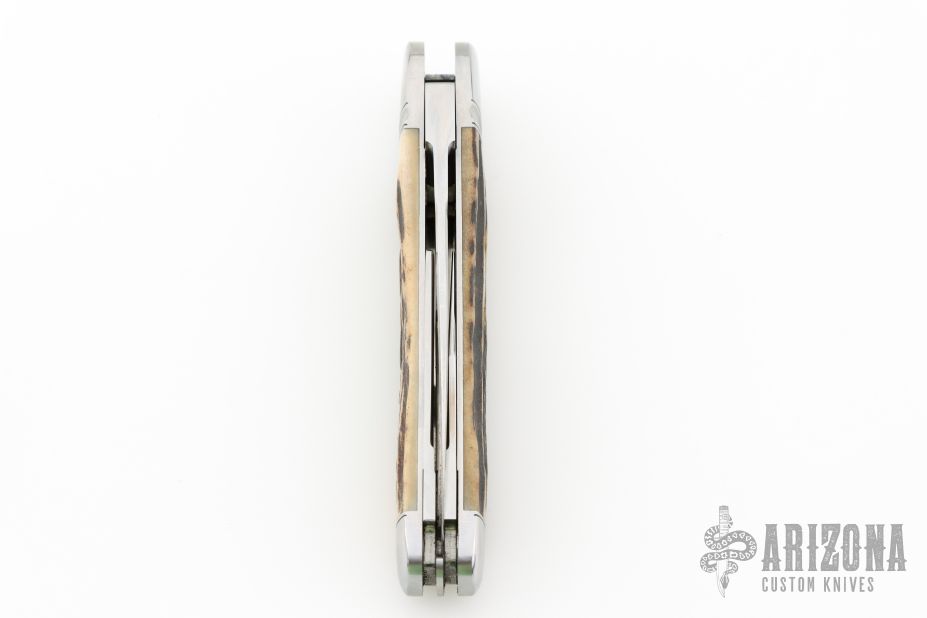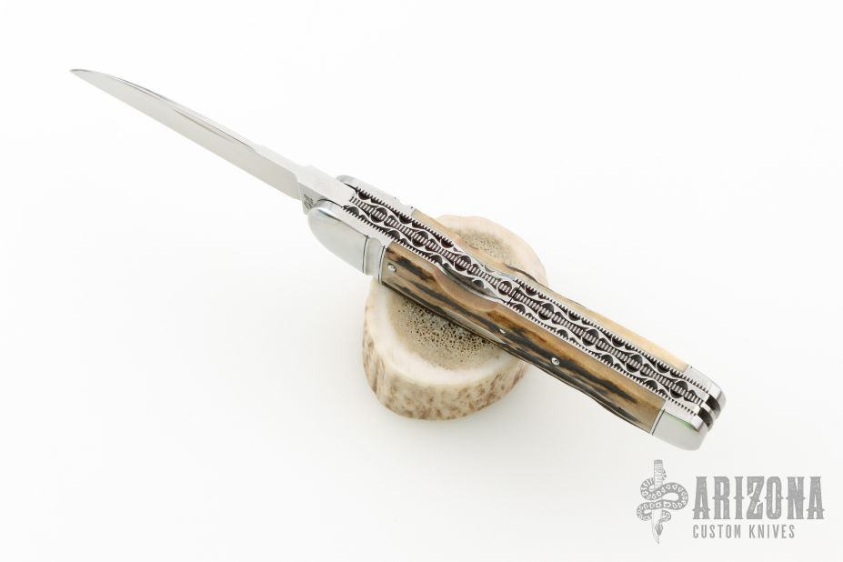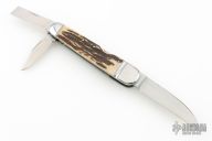 This Lockback Whittler by Tobin Hill, features a large single blade that is engaged by the lockback. The remaining two blades are slipjoints, they both have half stops and are flush in all positions. The handle has stainless steel bolsters, stag covers with a stainless steel escutcheon, file-worked and coin edge stainless steel liners and springs. Includes maker's padded zippered case. New from Maker at the Blade Show West!