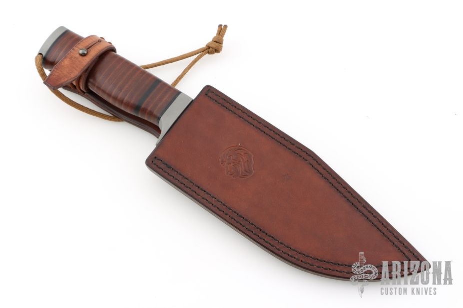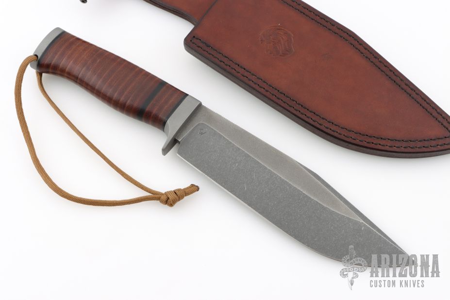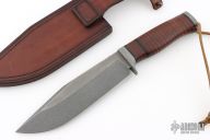 This Aldo by Petr Weingartner features a clip point blade with false top edge and notched thumbrest, .204" blade stock and 1.826" blade depth, hidden tang construction. The handle has a steel guard and butt cap with a beeswax infused stacked leather grip.  Includes a brown leather sheath and COA dated 9/30/25. New from maker.