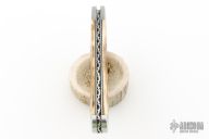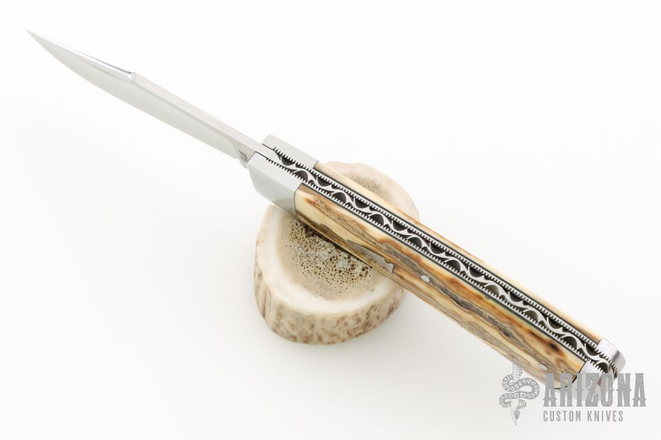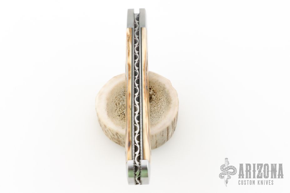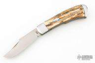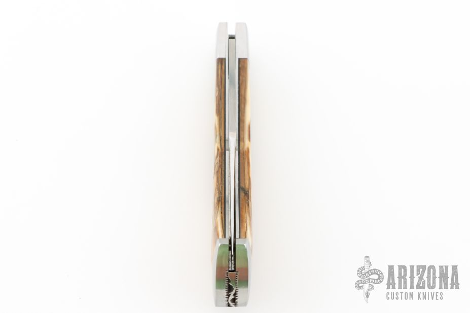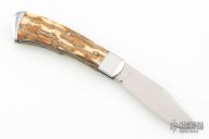 This "Hill Lock" Trapper by Tobin Hill features a hand rub satin finished clip point blade with a nail nick.  The handle features stainless steel bolsters, mammoth ivory covers with black liners and a stainless steel escutcheon, coin edge stainless steel liners, and a file worked stainless steel backspacer connected to the rear bolsters forming the "Hill Lock". Once open, press down on the rear bolsters to release the lock and close the knife. Includes maker's padded zippered case.  Brand New from maker at the 2025 Blade Show West!