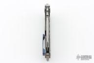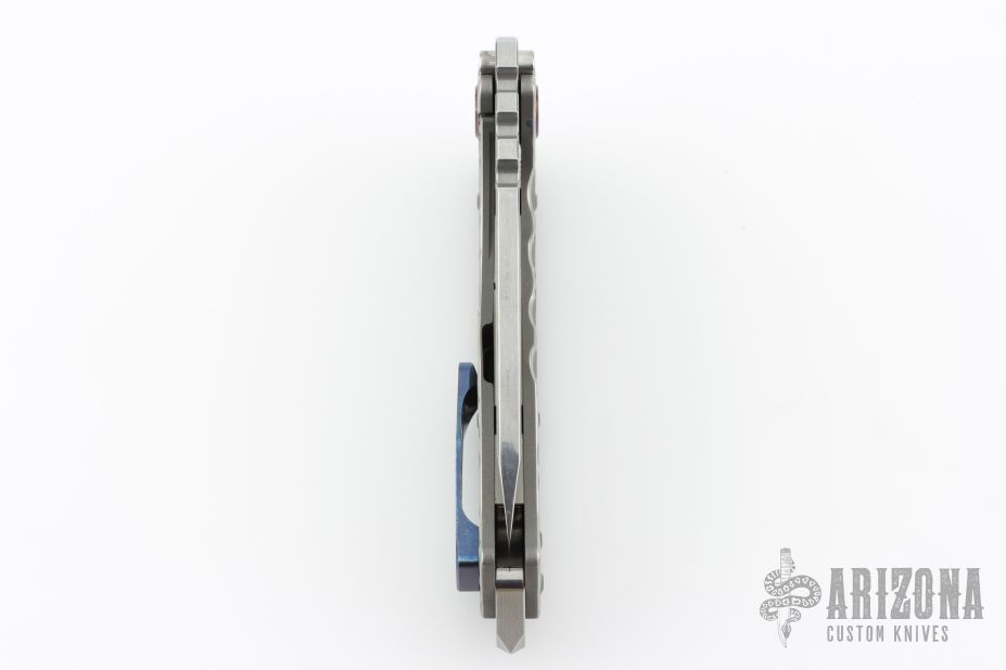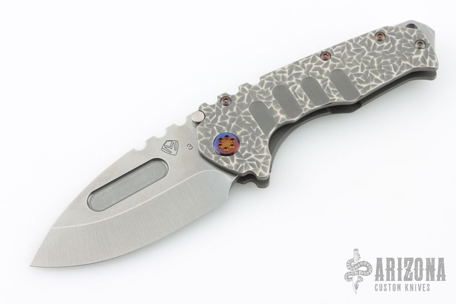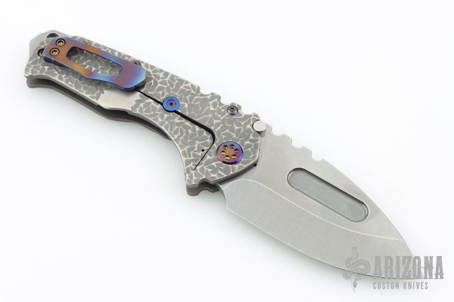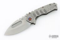 This Praetorian T by Medford Knife and Tool features a tumble finished blade with fullers and notched thumbrest. The handle has a "Hammered" finished and blasted titanium frame with a titanium tip up pocket clip and a D2 backspacer/glass breaker with lanyard bail.  Includes original box, hard case and COA dated June 17, 2022. Excellent condition.