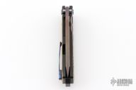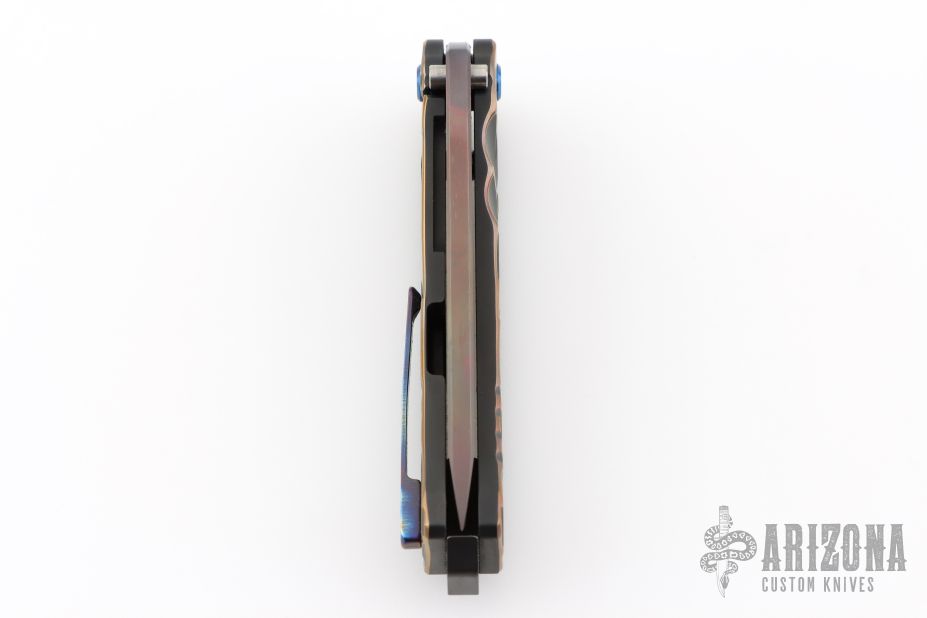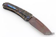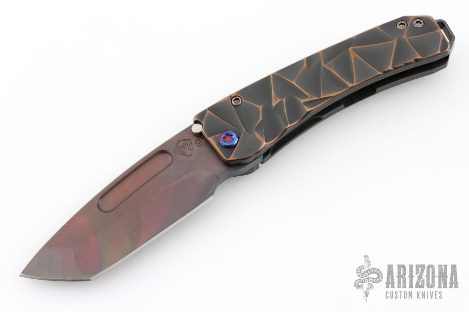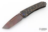 This Midi Marauder from Medford Knife and Tool features a Vulcan finished tanto blade with fullers.  The handle has a "Stained Glass" carved titanium frame with PVD and rose flats finish, with exposed lanyard bail in backstrap. Excellent detent, lockup, and seating. Original box, hard case and papers dated October 11, 2022. Excellent condition.