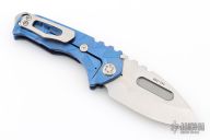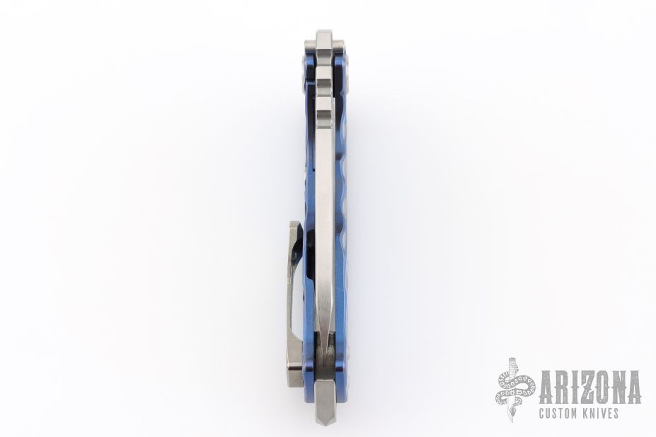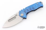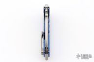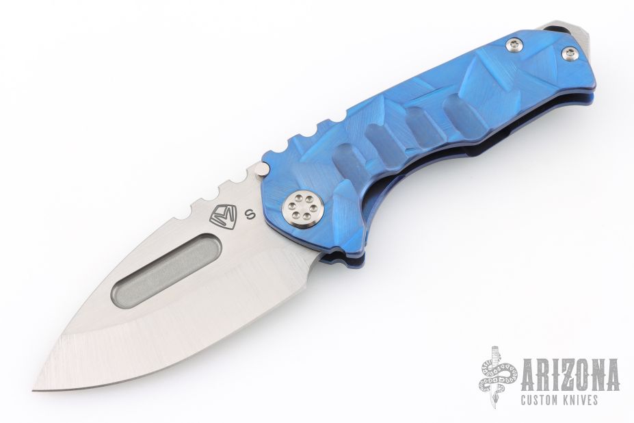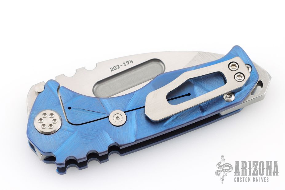 This Praetorian Genesis T from Medford Knife and Tool features a satin finished drop point style blade with fuller, notched thumb rest and dual thumb studs. The handle has an anodized "Stained Glass" titanium frame over a D2 backspacer/glass breaker. Anodized titanium tip up clip. Great blade seating, detent and lock up. Includes the original box, case, and papers dated October 11, 2022. Excellent condition.