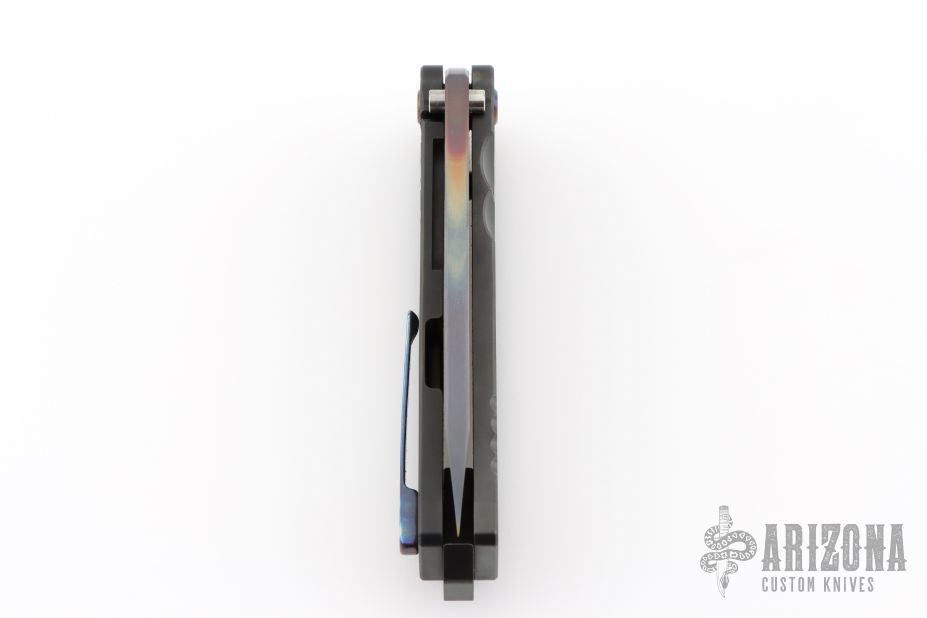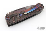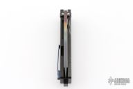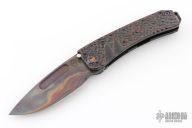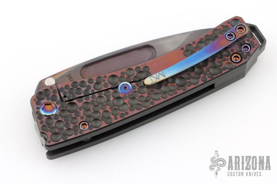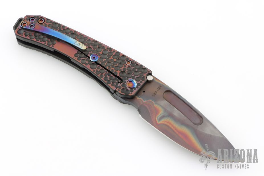 This Midi Marauder from Medford Knife and Tool features a Vulcan finished drop point style blade with fullers.  The handle has a PVD "Dimples" frame with rose flats, with exposed lanyard bail in backstrap. Excellent detent, lockup, and seating. Original box, hard case and papers dated October 11, 2022. Excellent condition.