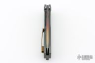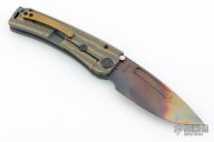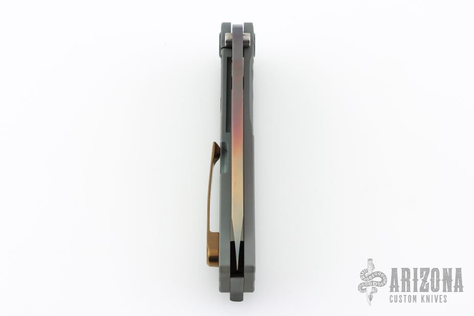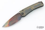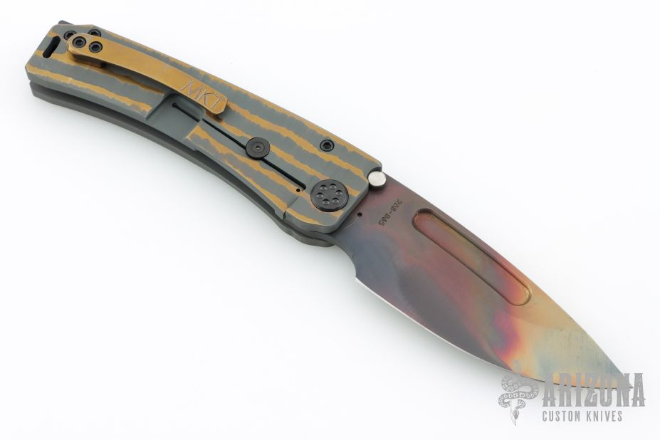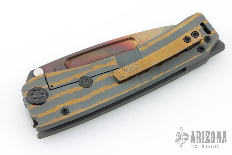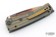 This Marauder from Medford Knife and Tool features a Vulcan finished blade with fullers. The handle has a bead blasted "Cement" with bronzed "Bark" finished titanium frame over a PVD steel backspacer and titanium tip up clip. Includes original box, hard case and COA dated September 12, 2022.  Excellent Condition.