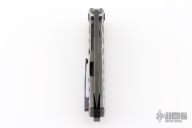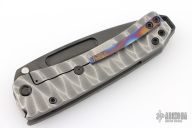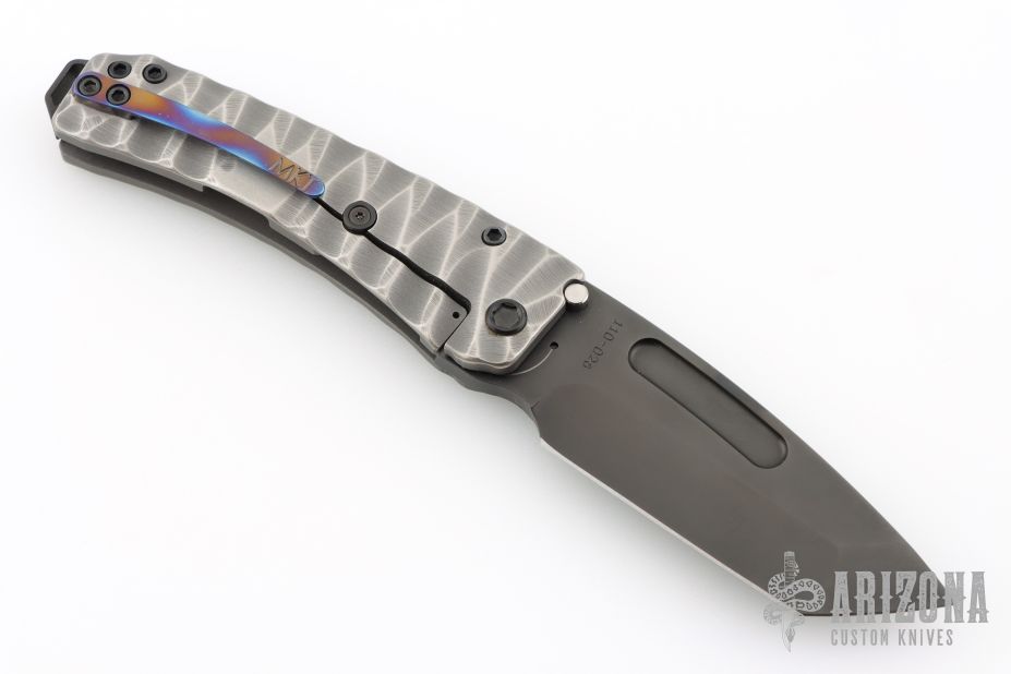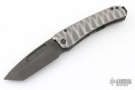 This Praetorian Genesis T from Medford Knife and Tool features a PVD finished tanto blade with fuller, notched thumbrest and dual thumbstuds. The handle has a tumbled "Diamond Cut" titanium frame over a D2 backspacer/glass breaker. PVD titanium tip up clip. Great blade seating, detent and lock up. Includes the original box, case, and papers dated August 18, 2022. Excellent condition.