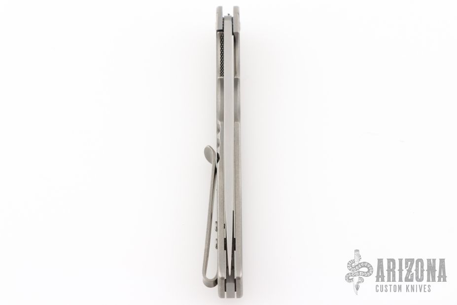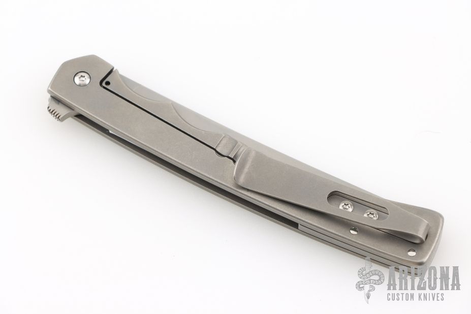 This Flipper by Jason Clark features a bead blast finished blade with a notched flipper. The handle has titanium covers, floating backstrap and tip up clip. Rides on IKBS, nice detent, lockup and blade seating. Comes with a leather slip sheath and COA. New from maker at the 2025 Blade Show West!