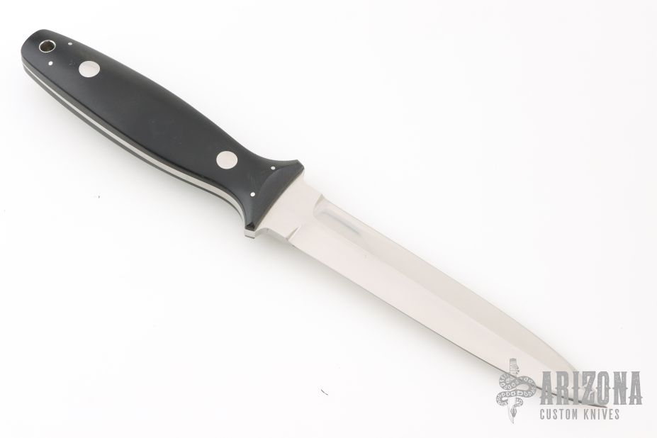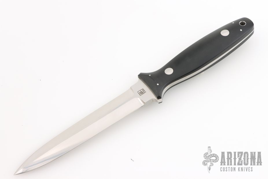 This Dagger by Bob Lum features a hand rub satin finished double edged blade with .187" blade stock and .956" blade depth, full tapered tang construction. The handle has black linen micarta scales. Excellent condition.
