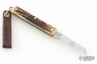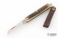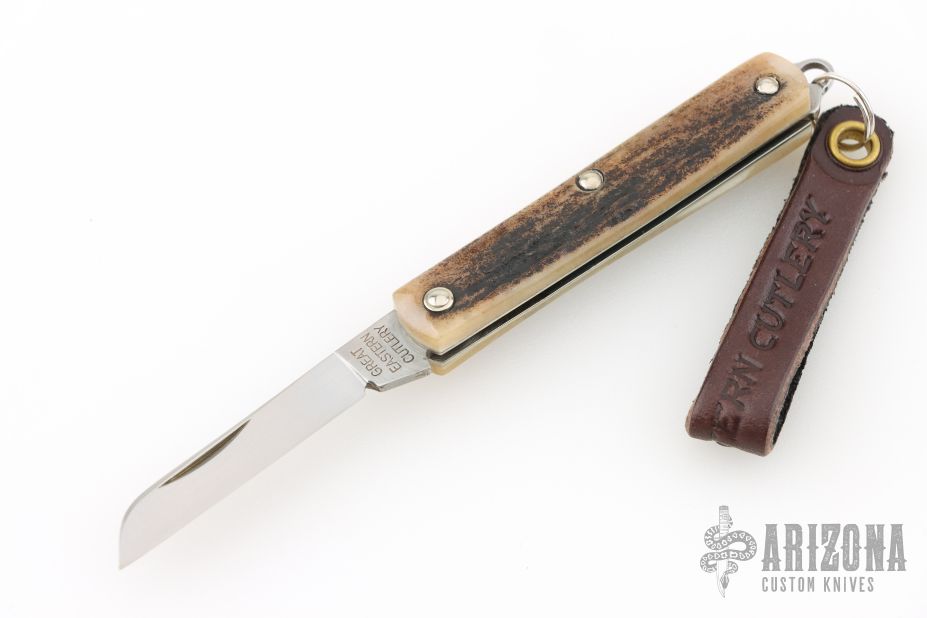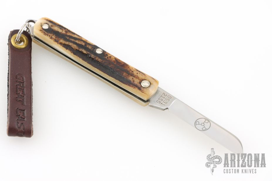 It is always handy to have a keychain knife, especially one as stylish and utilitarian as the #05 from Great Eastern Cutlery. This simple, single blade pen knife has an extended back spring with a hole for attachment of the included split ring and stamped leather lanyard, making this a great choice for fifth pocket carry as well. This version comes with a satin finished stainless steel Sheepsfoot blade and Sambar Stag covers. The blade is marked "PPP" for "Pattern Production Premiere".