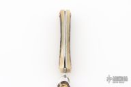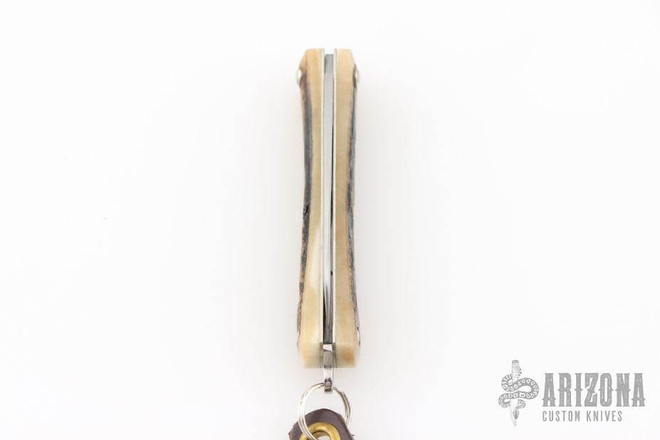 Handle: Built with traditional brass liner and pin construction, the compact handle has rugged Sambar Stag covers sans shield to showcase the natural texture. The handle offers a solid three finger grip with an extended hole milled back spring for keychain or lanyard attachment. The full length back spring protects the blade when closed and delivers classic slip joint operation.