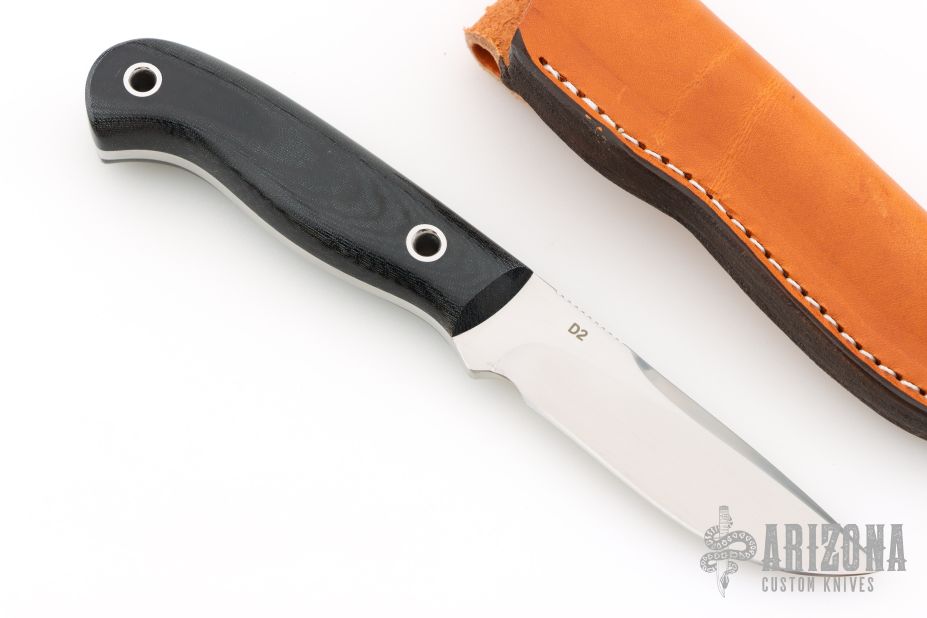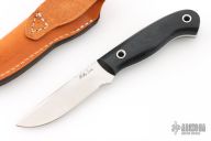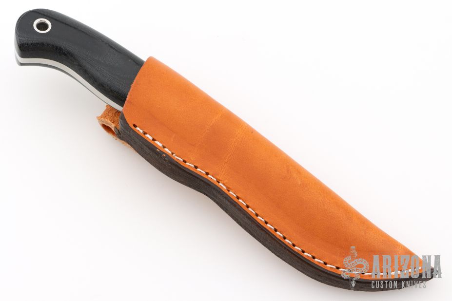 This hunter by Mike Irie features a hand rubbed satin finish blade with notched thumbrest, .144" blade stock and .905" blade depth, full tang construction. The handle has black canvas micarta scales. Excellent fit and finish. Brown leather sheath. New from maker at the 2025 Blade Show West!