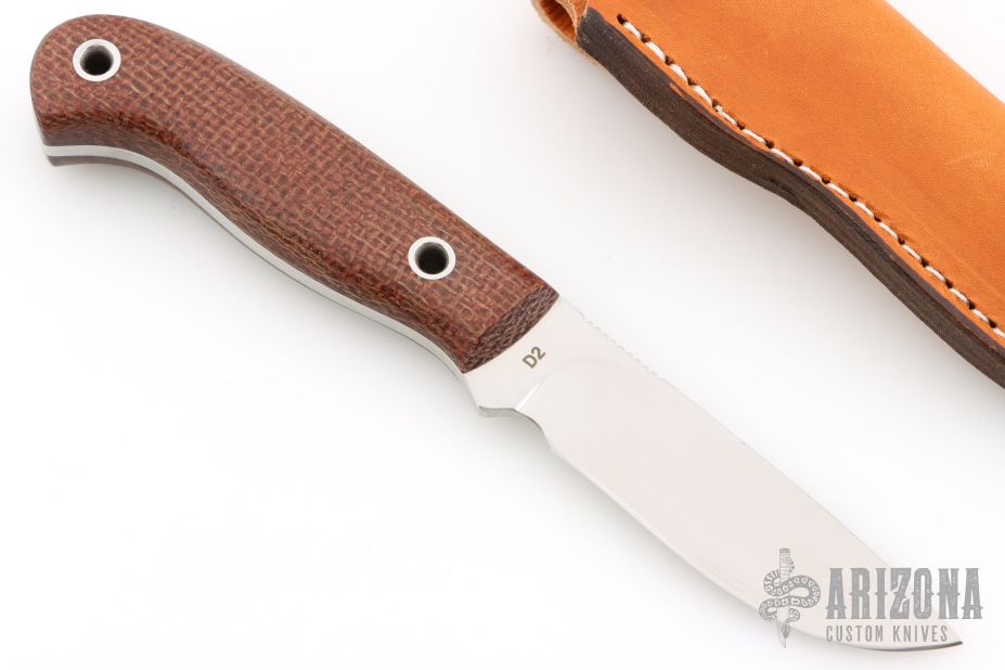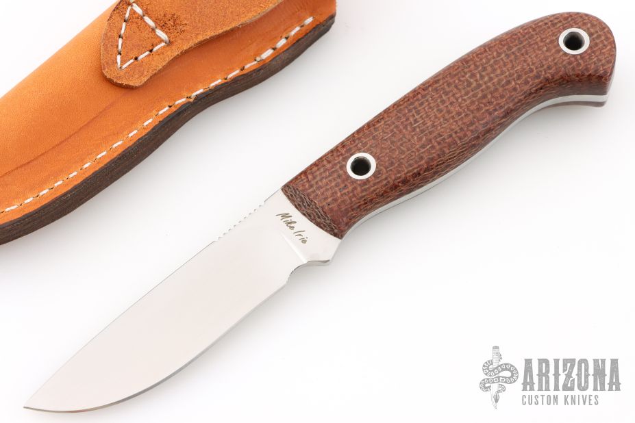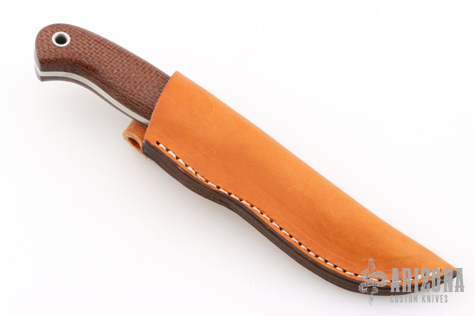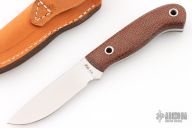 This hunter by Mike Irie features a hand rubbed satin finish blade with notched thumbrest, .145" blade stock and .90" blade depth, full tang construction. The handle has burlap micarta scales. Excellent fit and finish. Brown leather sheath. New from maker at the 2025 Blade Show West!