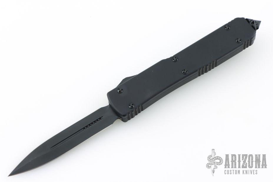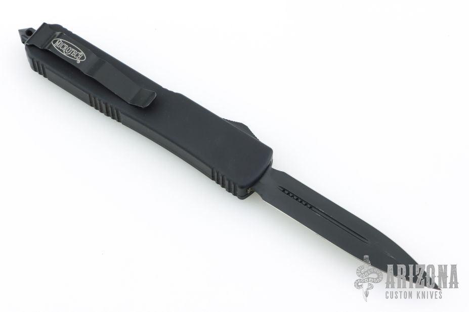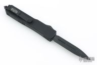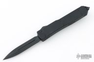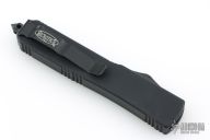 This Ultratech from Microtech Knives features a double edged, black coated spear point blade. The handle is comprised of black anodized aluminum with all black matching hardwear. Skull crusher and lanyard bail on pommel. Dated 10/12 with a Serial # of 086. Ghosted Skull with X'd out eyes on presentation side. Has a light scuff on the center of the blade that is clearly visible in the pictures, and the worlds most minor wear on the edges of the clip, otherwise excellent condition for a 13 year old knife. Includes original box, drawstring bag and papers.