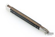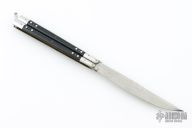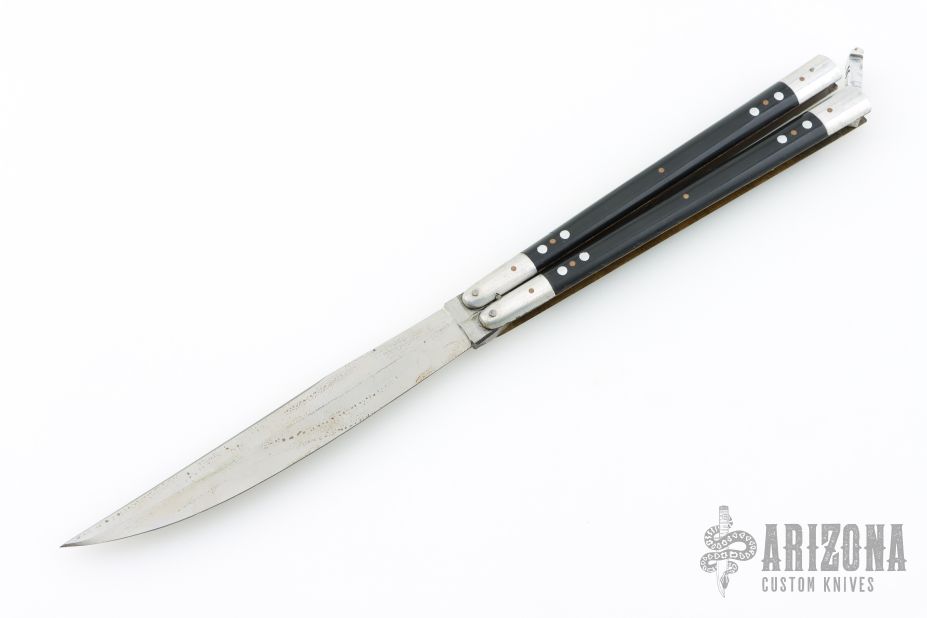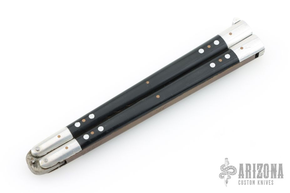 This balisong from the Philippines features a clip point blade. The handle has aluminum bolsters, black scales, aluminum T-latch. Has a scratches and patina, otherwise good condition.