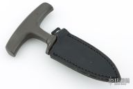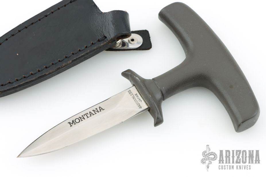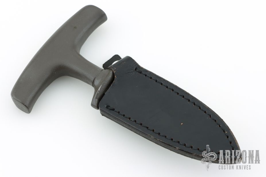 This vintage push dagger by Valor features a hand rub satin finished double edged blade with .152" blade stock and .765" blade depth, hidden tang construction with a gray aluminum grip. Comes with a black leather boot sheath. Excellent condition.