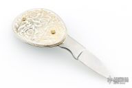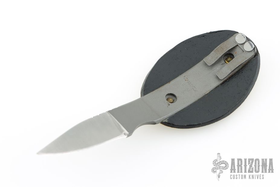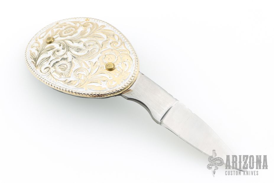 Belt Buckle knife by Daniel Valois. The handle is a decorative belt buckle. DOES NOT COME WITH A BELT. Has a few light scuffs, otherwise excellent condition.