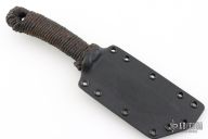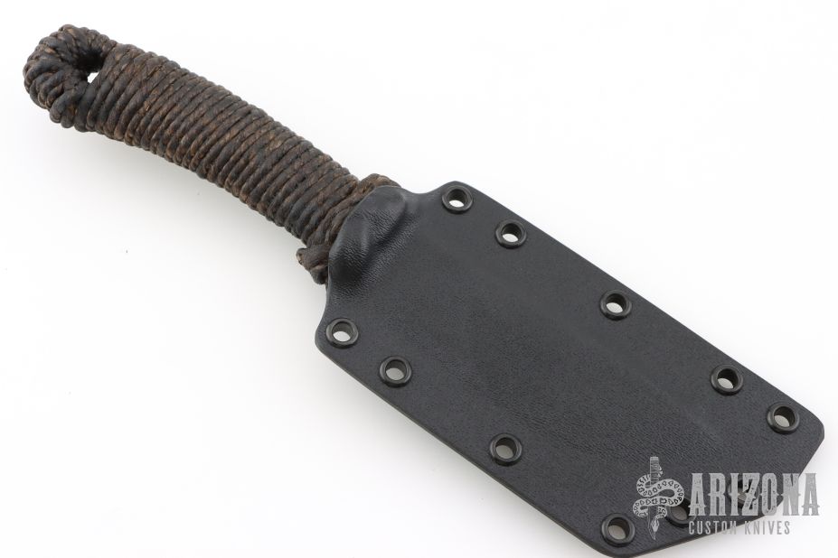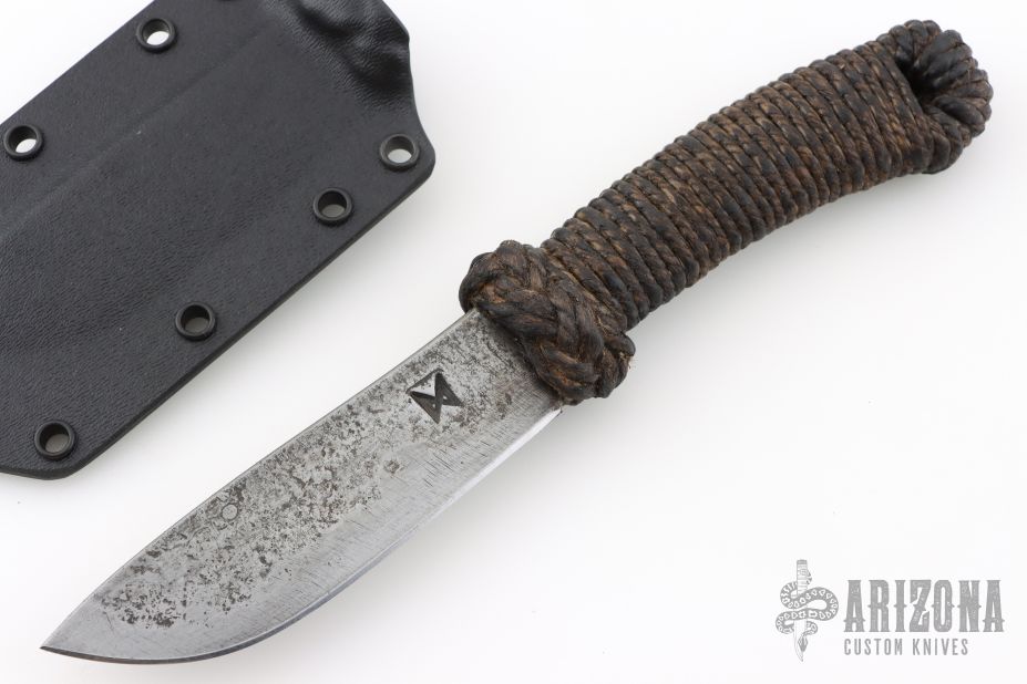This knife by James Helm features a hand forged blade, .161" blade stock and 1.218" blade depth, hidden tang construction. The handle has a hemp wrap grip that has been epoxied. Comes with a kydex sheath set up for TekLok. New from Maker at the 2025 Blade Show West!