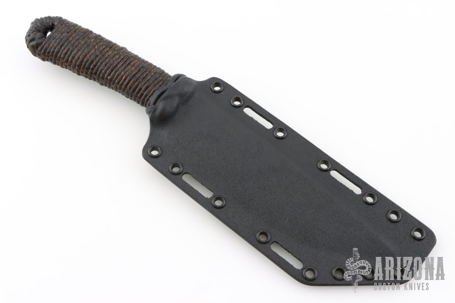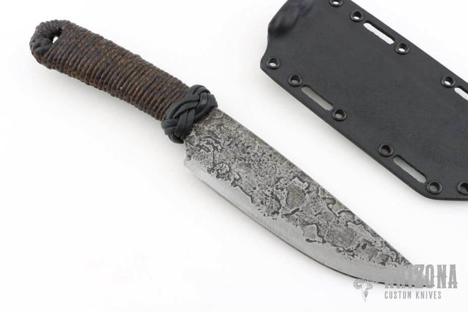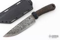 This knife by James Helm features a hand forged blade, .235" blade stock and 1.81" blade depth, hidden tang construction. The handle has a hemp and paracord wrap that has been epoxied. Comes with a kydex sheath set up for TekLok. New from Maker at the 2025 Blade Show West!