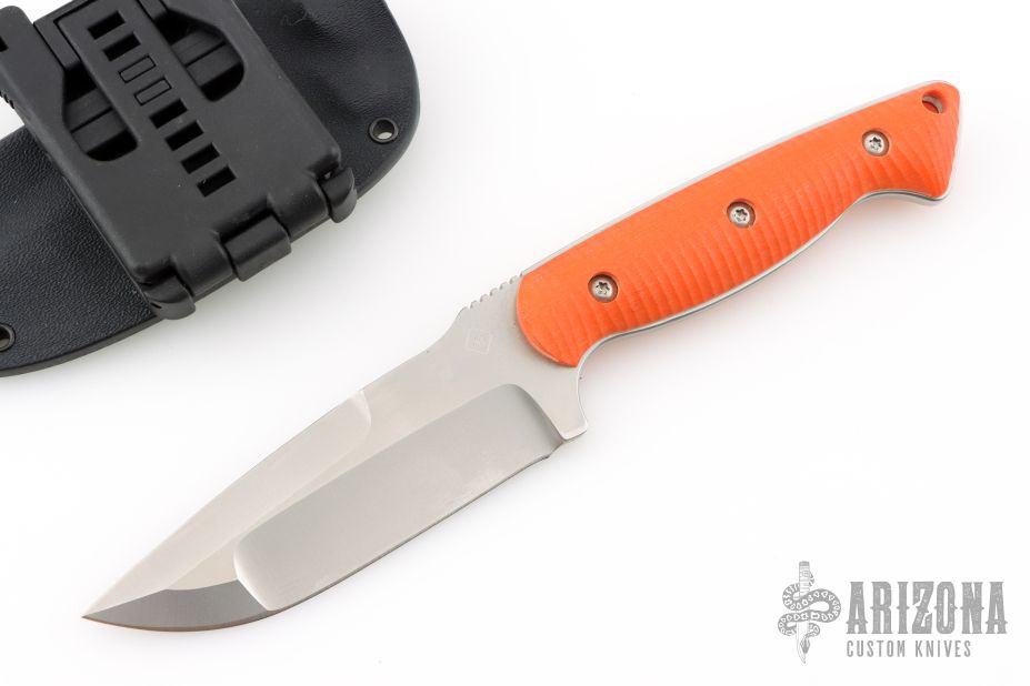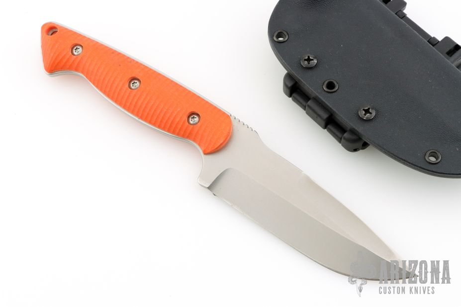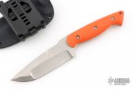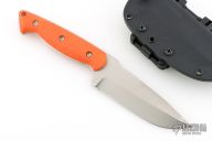 This Mini Extractor by Jim Burke features a blasted and multi-ground blade with a sharpened top edge and notched thumbrest, .157" blade stock and 1.401" blade depth, full tang construction. The handle has milled orange G-10 scales, lanyard hole at the butt. Comes with Kydex sheath with TekLok. Excellent condition.