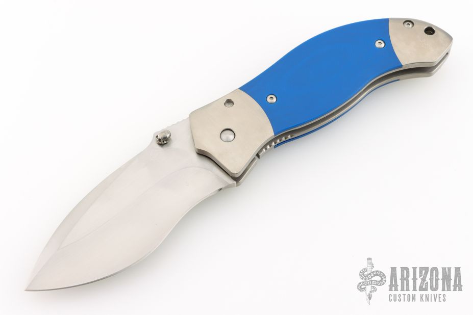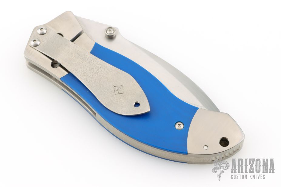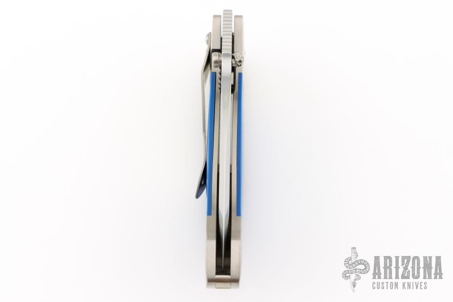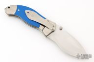 This Resurrection by Jim Burke features a hand rub satin finished recurve blade with single skull thumbstud and notched thumbrest. The frame is satin finished titanium with integral bolsters, blue G-10 inlays, orange peel finished titanium backspacer and tip down clip. Nice lockup and blade seating. Excellent condition. Comes with zippered case.