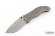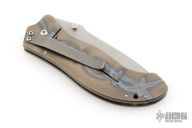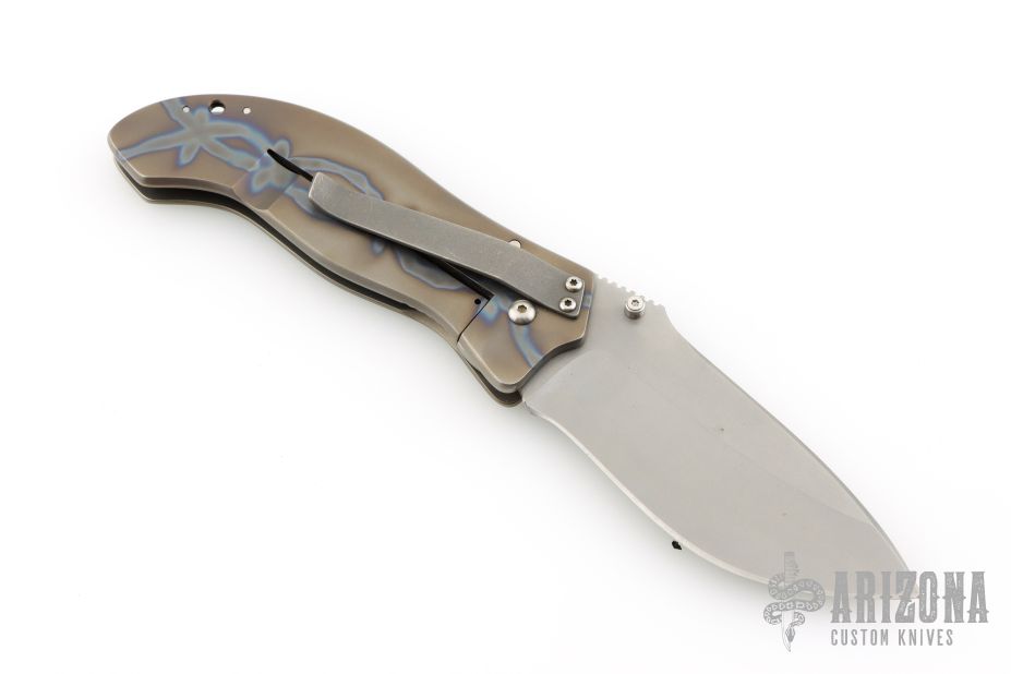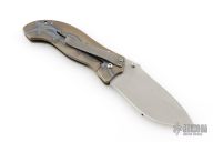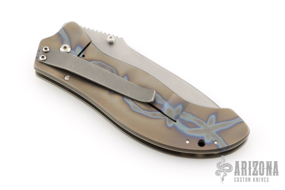 This Resurrection framelock folder by Jim Burke features a tumble finished blade with single skull thumbstud and notched thumbrest. The handle is flame anodized and bead blasted titanium with tumbled titanium pocket clip, tip down carry, and titanium barrel spacers. Nice detent, lockup and blade seating. Has some light scuffs, otherwise excellent condition. Comes with a Velcro case.