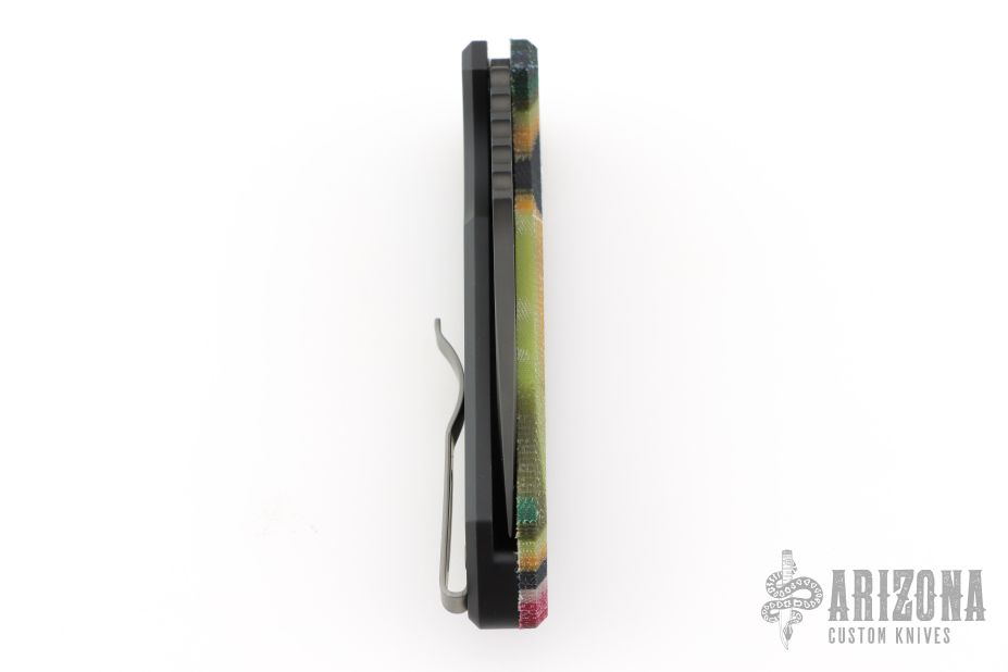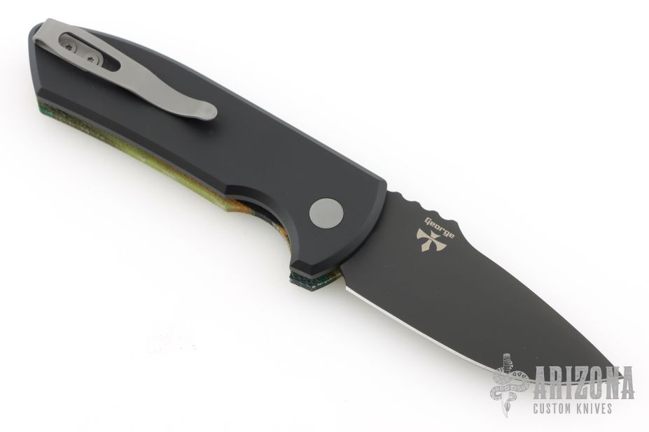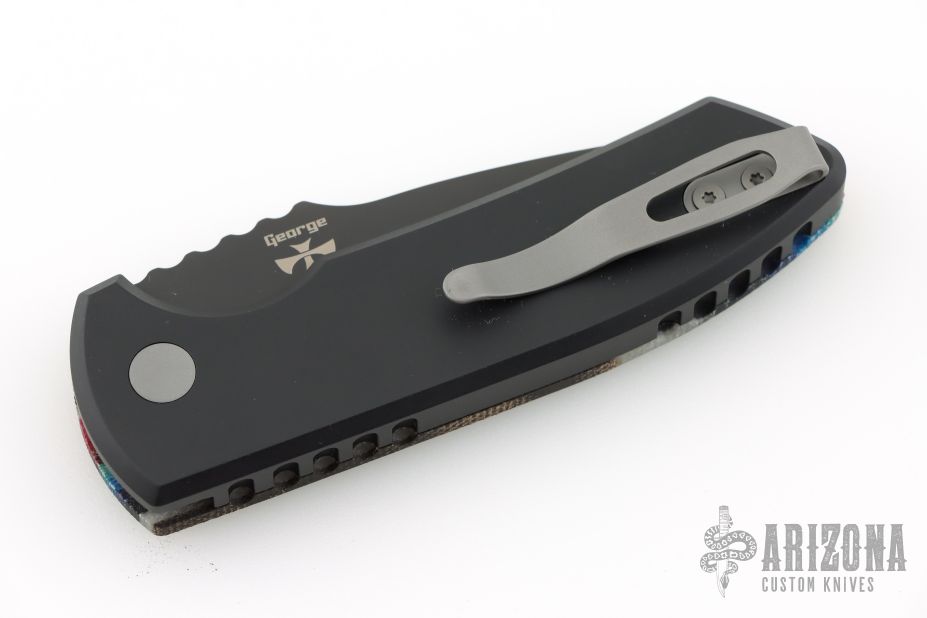 This one has Unique Micarta front and pearl inlaid push button. Comes with original box and papers. New from maker at the 2025 Blade Show West!