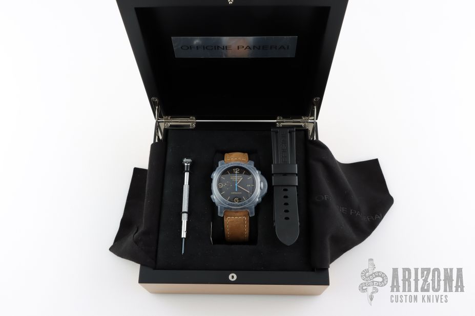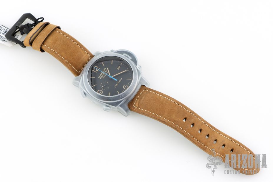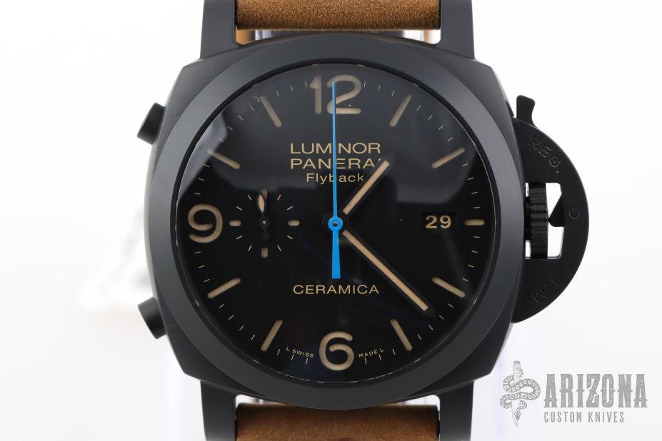 The Luminor 1950 3 Days Chrono Flyback Automatic Ceramica (PAM00580) is supplied with a natural untreated leather strap and a second strap made of rubber. The buckle is in titanium, a light, strong, hypo-allergenic material to which a special resistant black coating has been applied so that it matches the appearance of the watch, and it is easily