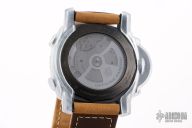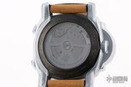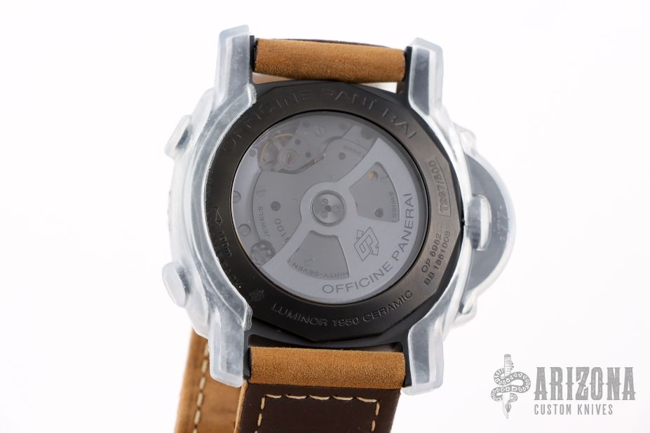On the back of the case a large porthole in sapphire crystal reveals the P.9100 manufacture movement, the first chronograph calibre with automatic winding completely developed and made in the Officine Panerai manufacture.