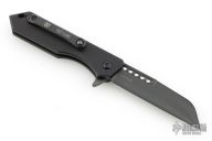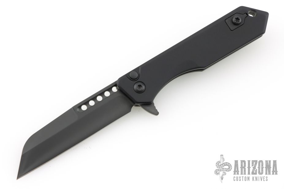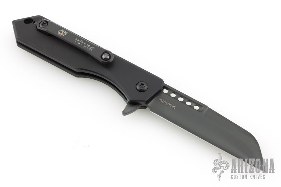This Jinn button lock flipper by Heretic Knives features a DLC wharncliffe blade with fuller and a false top edge. The handle has a black aluminum chassis, backspacer, hardware tip up clip. Has a lanyard hole at the butt and a black filler tab for the reversible clip. Comes with original box. Dated 10/25 S/N will vary from the photos. New from maker at the 2025 Blade Show West!