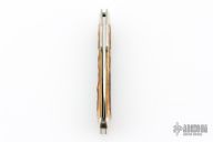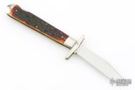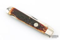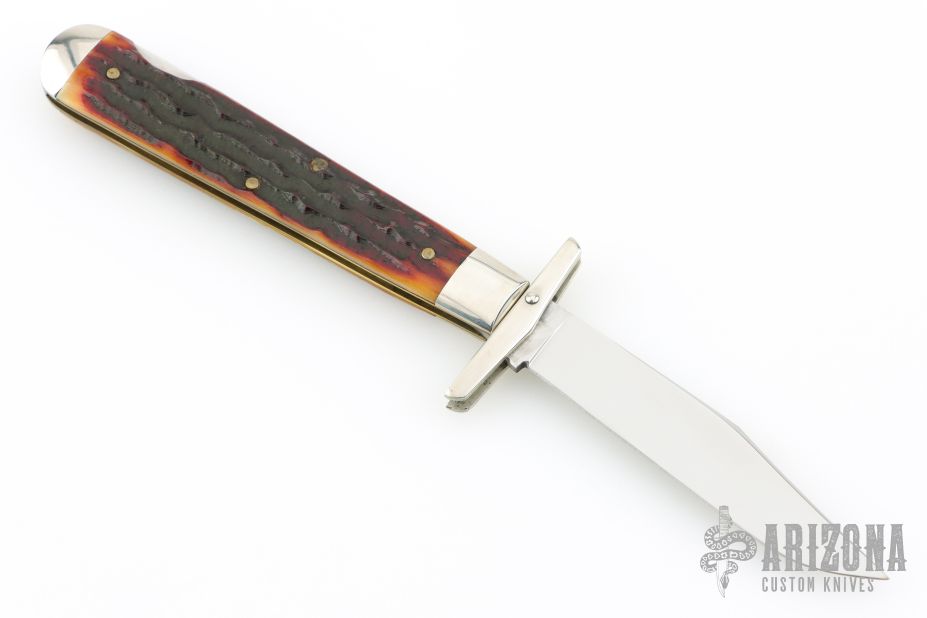 This swing guard lock back by Queen Cutlery Co features a mirror finished blade with nail nick. The handle has nickel silver bolsters and swing guard, jigged bone scales, brass liners, stainless steel spring. Has a couple light scratches, otherwise excellent condition.