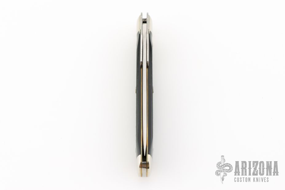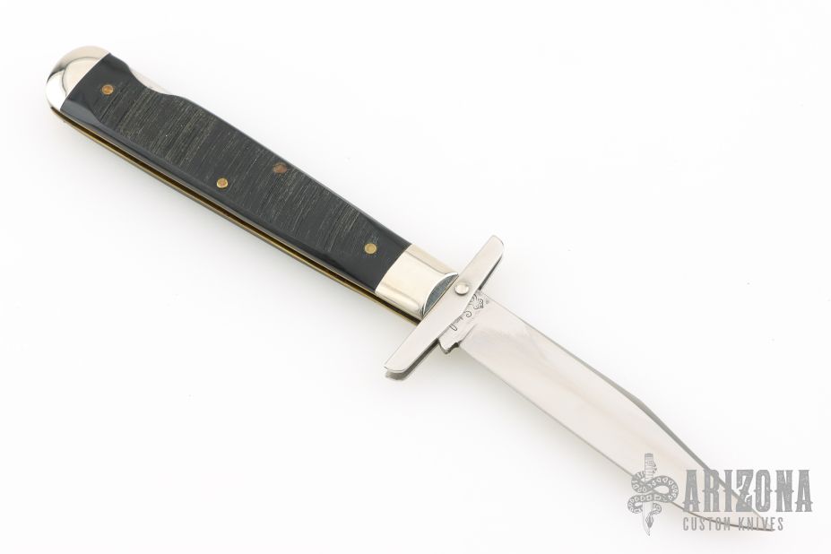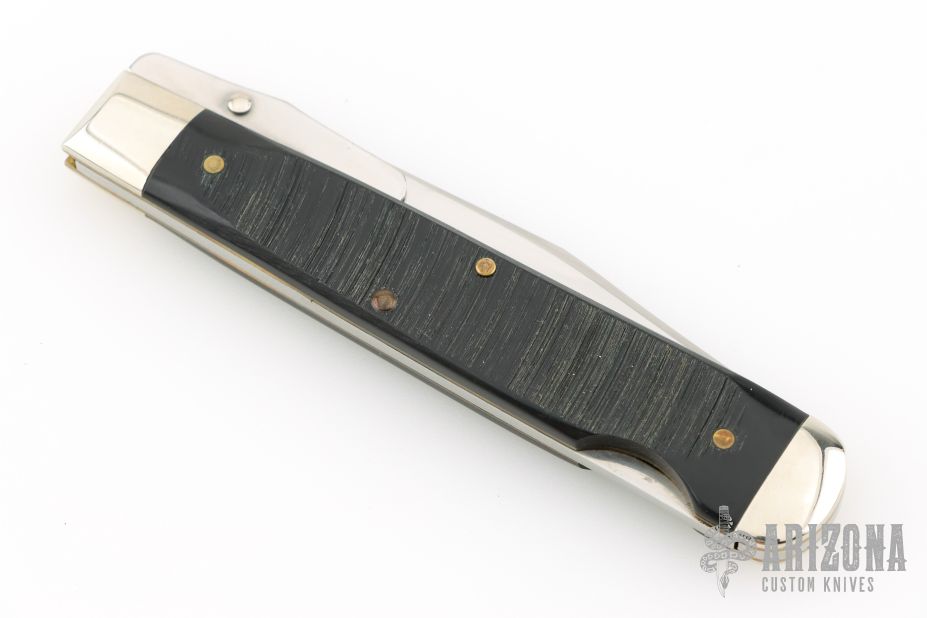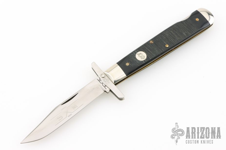 This swing guard lock back by Queen Steel and Schatt and Morgan features a mirror finished blade with nail nick. The handle has nickel silver bolsters and swing guard, black sawcut Delrin scales, brass liners, stainless steel spring. Has some light scratches, otherwise excellent condition.  Dated 1992