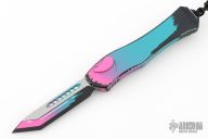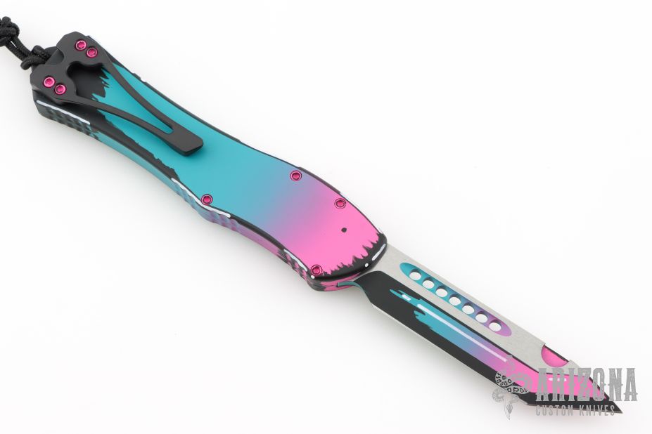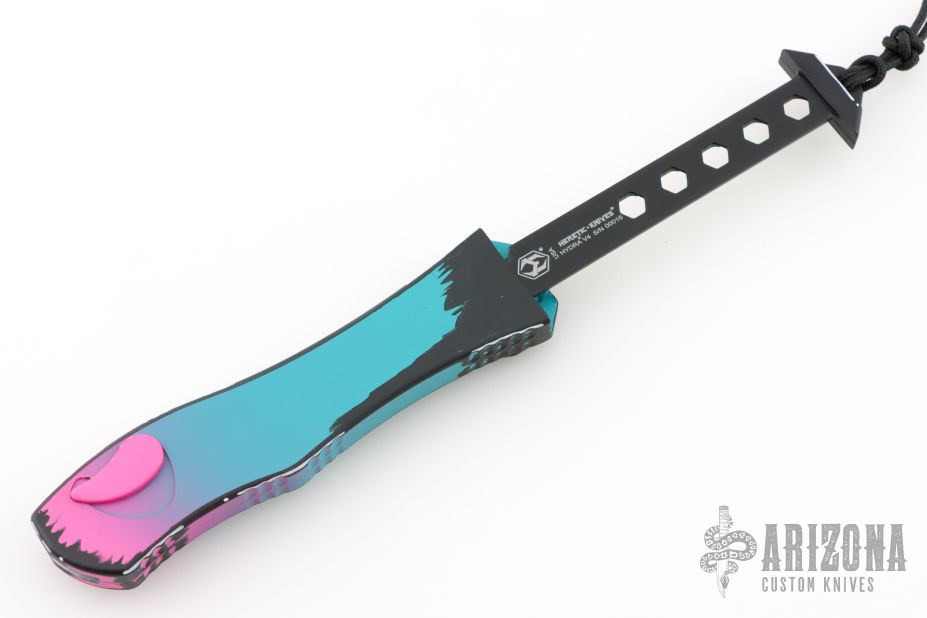 This Hydra by Heretic Knives (Anthony G. Marfione) features a Miami Vice tanto blade. The handle has a matching blue/pink aluminum frame, stainless clip, black charging handle. Comes with original box and lube. S/N 00016. New from maker at the 2025 Blade Show West!
