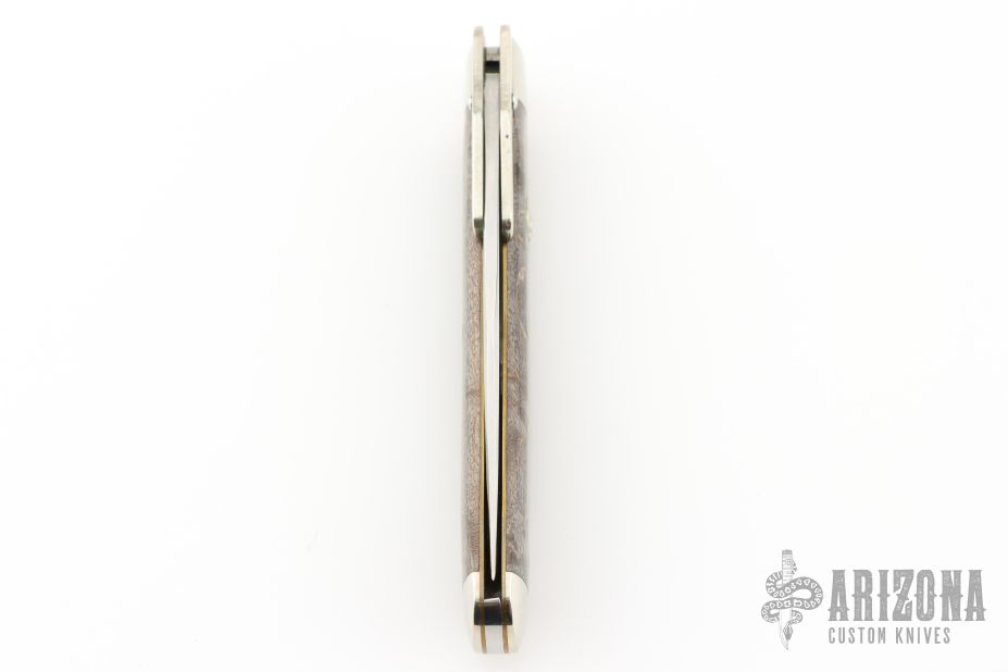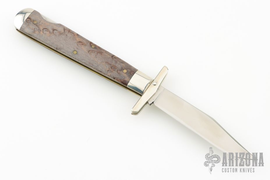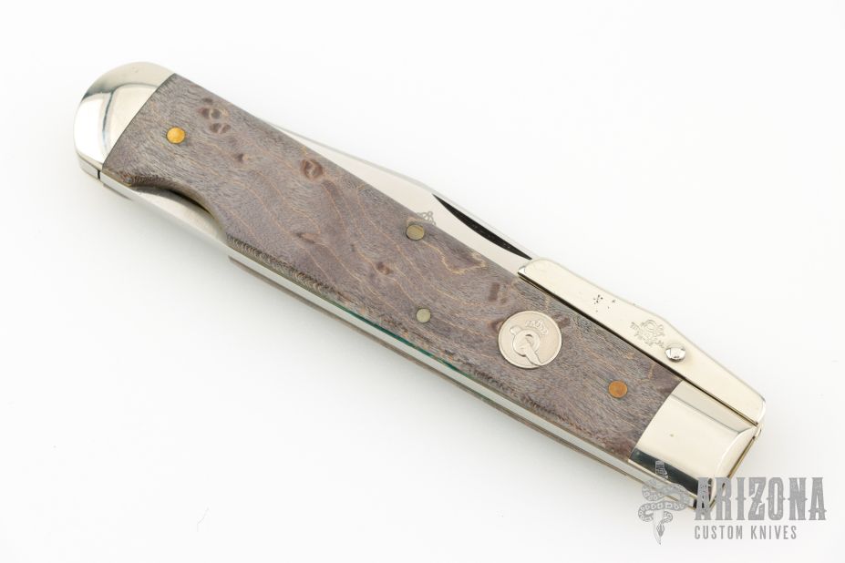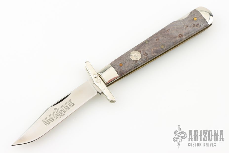 This swing guard lock back by Queen Cutlery Co features a satin finished blade with nail nick. The handle has nickel silver bolsters and swing guard, birds eye maple scales, brass liners, stainless steel spring. Has a couple light scratches, otherwise excellent condition.