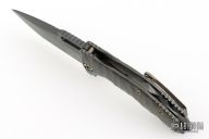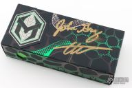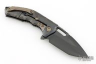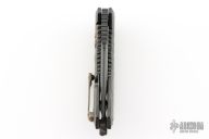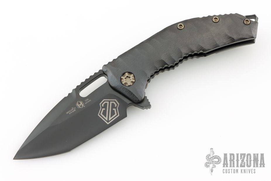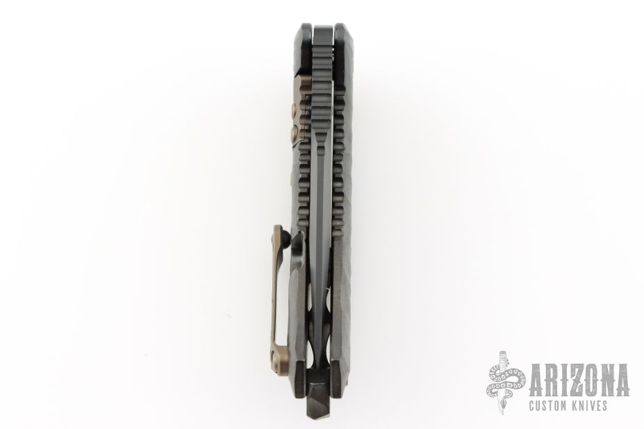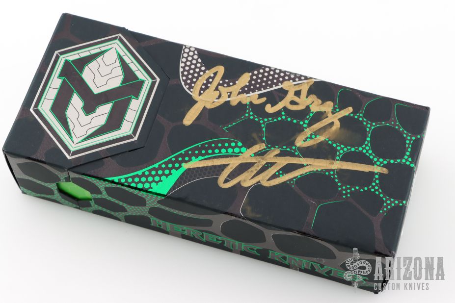 This Medusa Manual by Heretic Knives is a collaboration with John Gray. The knife features a black tanto blade with false top edge, notched thumbrest and flipper. The handle has a carved and darkened titanium handle, sculpted backspacer, and a tip up stainless steel clip with ceramic ball. Comes with original box, signed by both makers. New from makers at the 2025 Blade Show West!