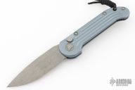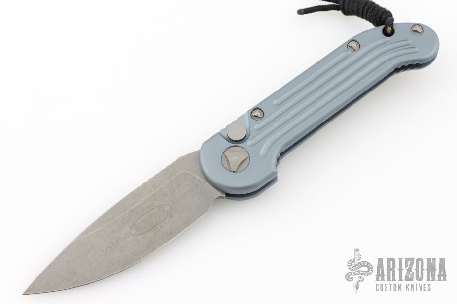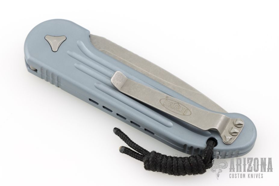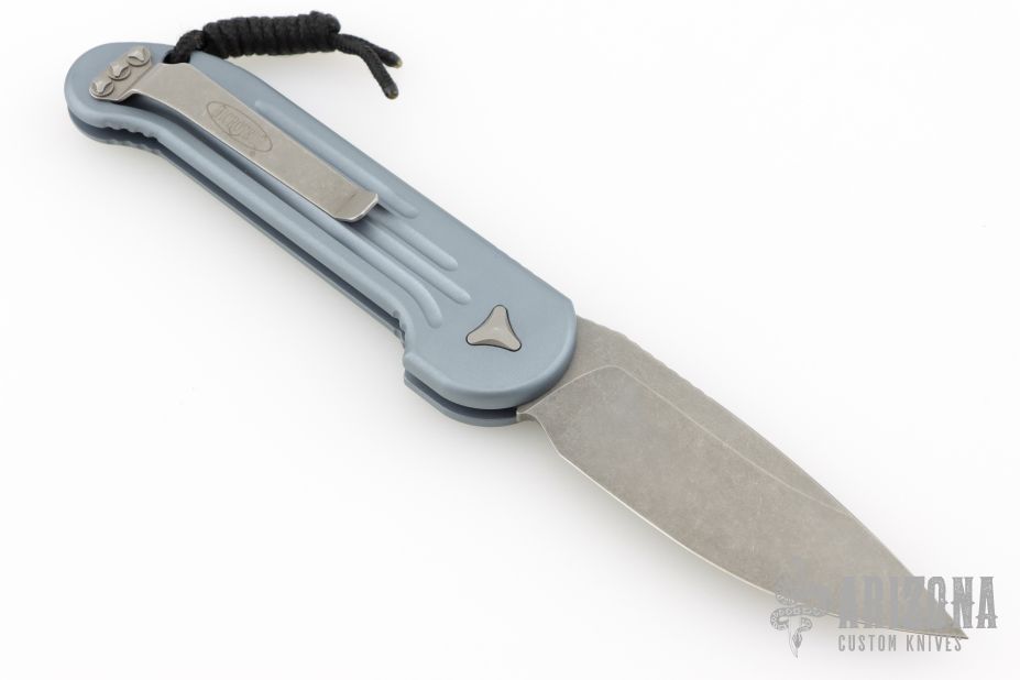 This LUDT side opening automatic by Microtech has an Apocalyptic finished blade with a standard edge and a contoured grey aluminum frame. Stainless steel clip. Dated 07/2016 and serial number 03040. Comes with original box. Excellent condition.