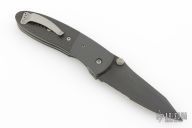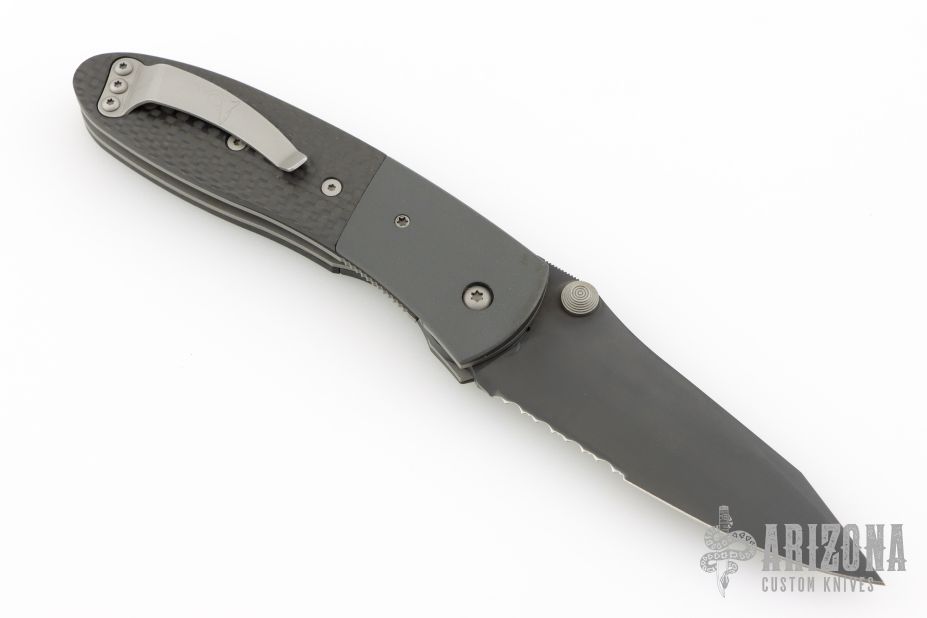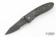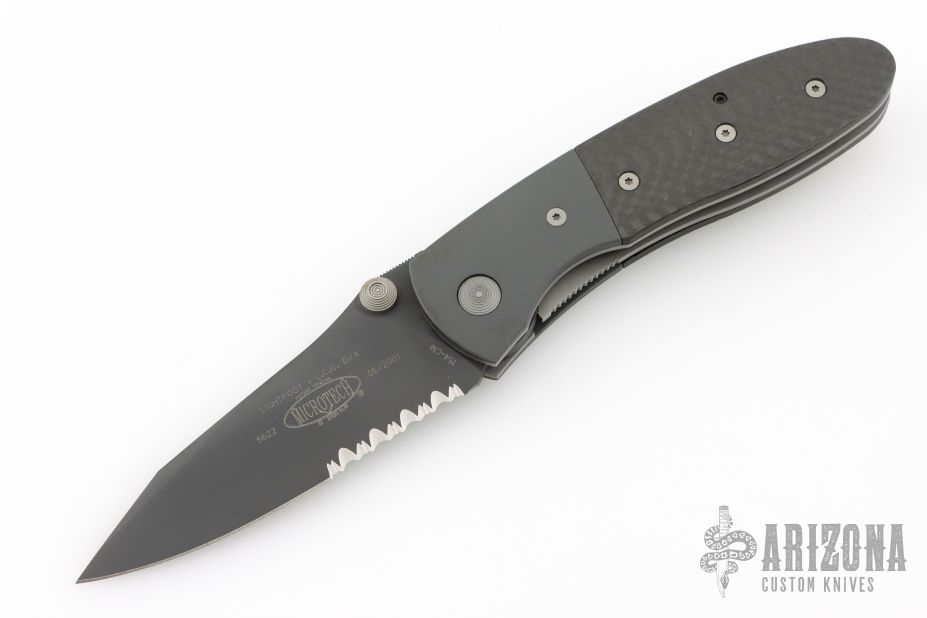 This Lightfoot LCC D/A side opener by Microtech has a black partially serrated blade, black titanium bolsters, and carbon fiber scales. Stainless steel clip and liners. Dated 05/2001 and #5622. Comes with original box, papers, and nylon sheath. Has a light scuff on the clip, otherwise excellent condition.