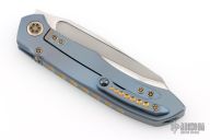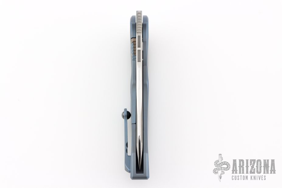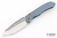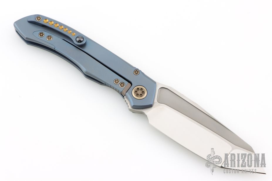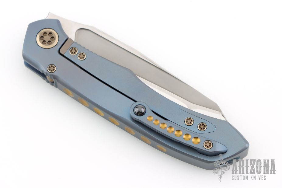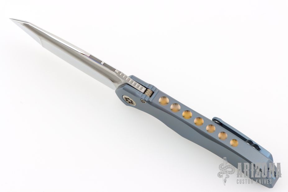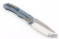 This Anax from Marfione Custom Knives features a mirror polished tanto blade with bead blasted cut-outs and satin flats, and a notched thumbrest. The handle has an integral titanium frame with optional lanyard attachment. Frame is anodized blue and hardware is anodized bronze. Nice detent, lockup and blade seating. "A. Marfione" inside the frame and dated 08/2015. Includes original box, COA and zippered case. Excellent condition.