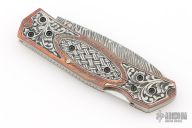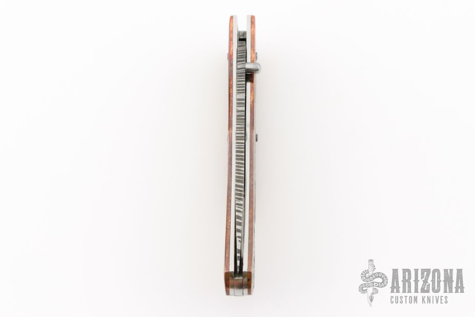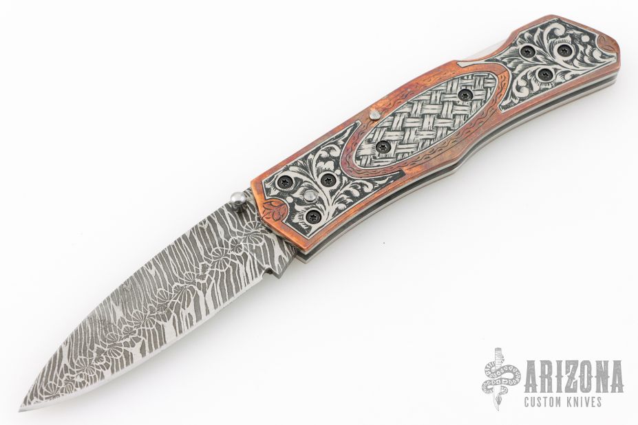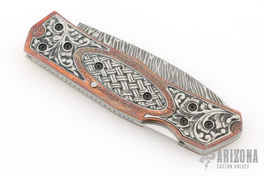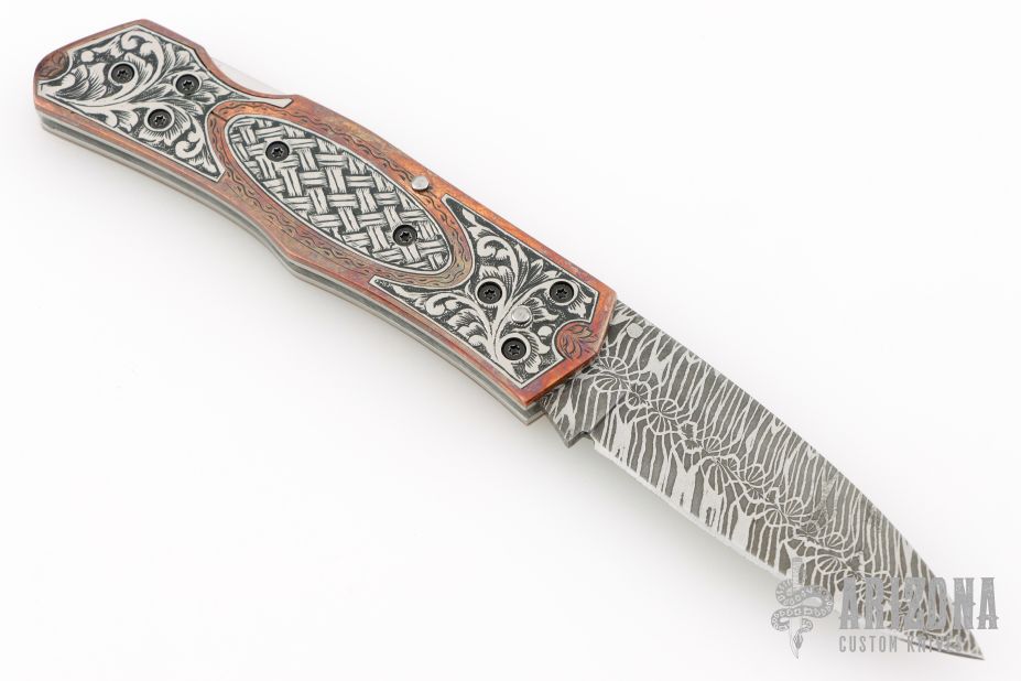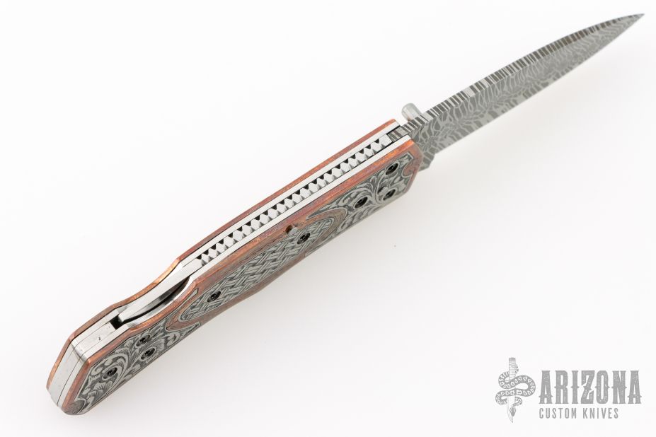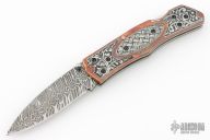 This lockback folder by EMA Forge features a Mosaic Damascus blade. The handle has engraved copper scales with engraved titanium inlays, stainless steel liners and fileworked backspacer. Nice lockup and blade seating. Comes with a brown leather sheath and original box. New from maker.