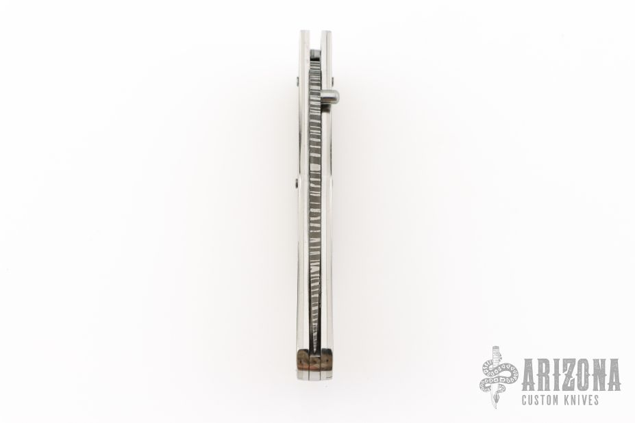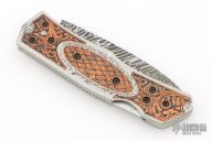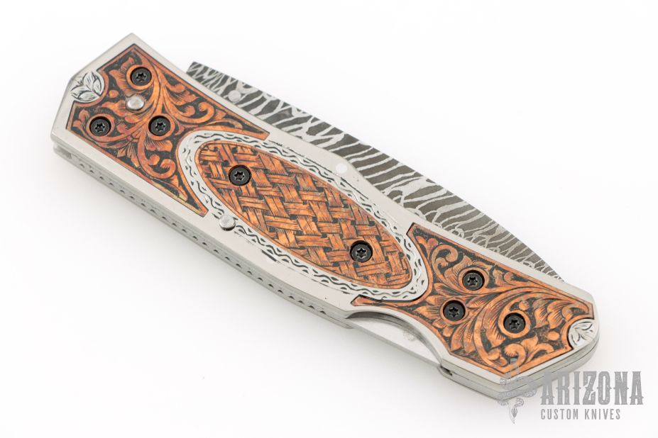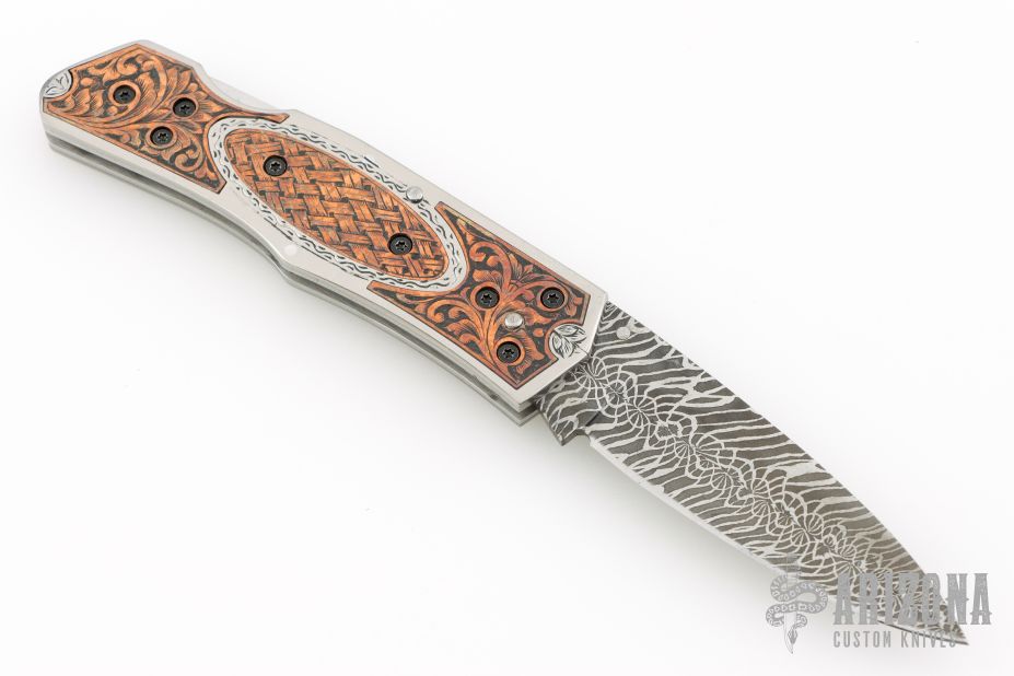 This lockback folder by EMA Forge features a Mosaic Damascus blade with single thumbstud. The handle has engraved titanium scales with engraved copper inlays, stainless steel liners and fileworked backspacer. Nice lockup and blade seating. Comes with a brown leather sheath and original box. New from maker.