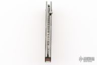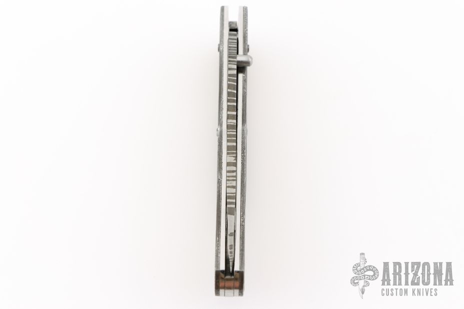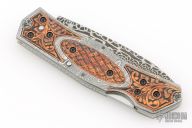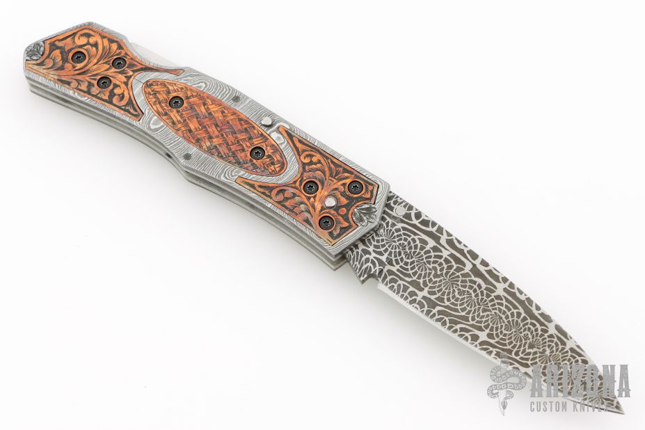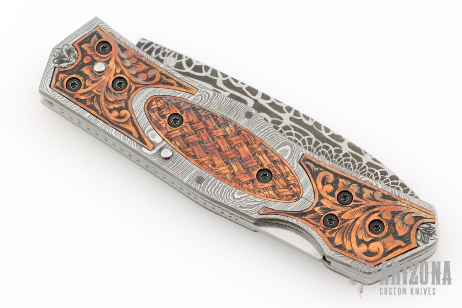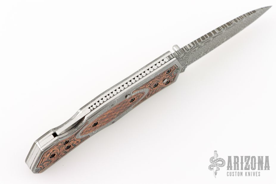 This lockback folder by EMA Forge features a Mosaic Damascus blade with single thumbstud. The handle has engraved Damascus scales with engraved copper inlays, stainless steel liners and fileworked backspacer. Nice lockup and blade seating. Comes with a brown leather sheath and original box. New from maker.