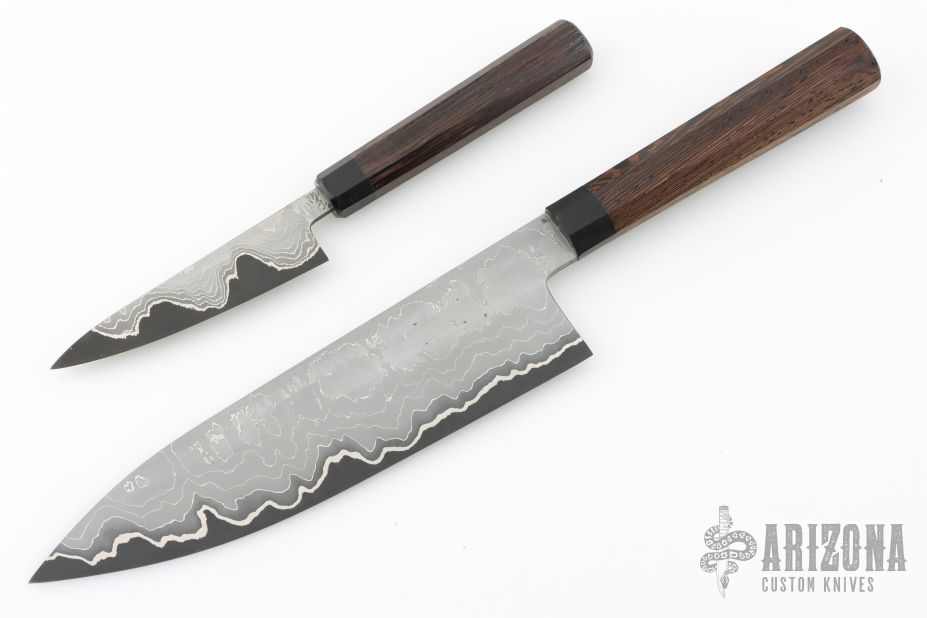 This custom Chef Knife by Nate Summers features a hand rub satin finish blade with hidden tang construction, .144" Blade Stock and 2.144" Blade Depth. The handle features a black ferrule and a wooden grip. The Petty knife has a matching set of materials, .101" blade stock, 1.075" blade depth, 4.5" blade length, 9.25" overall length and weighs 2 ounces. Both come in boxes. New from maker at the 2025 Blade Show West!