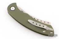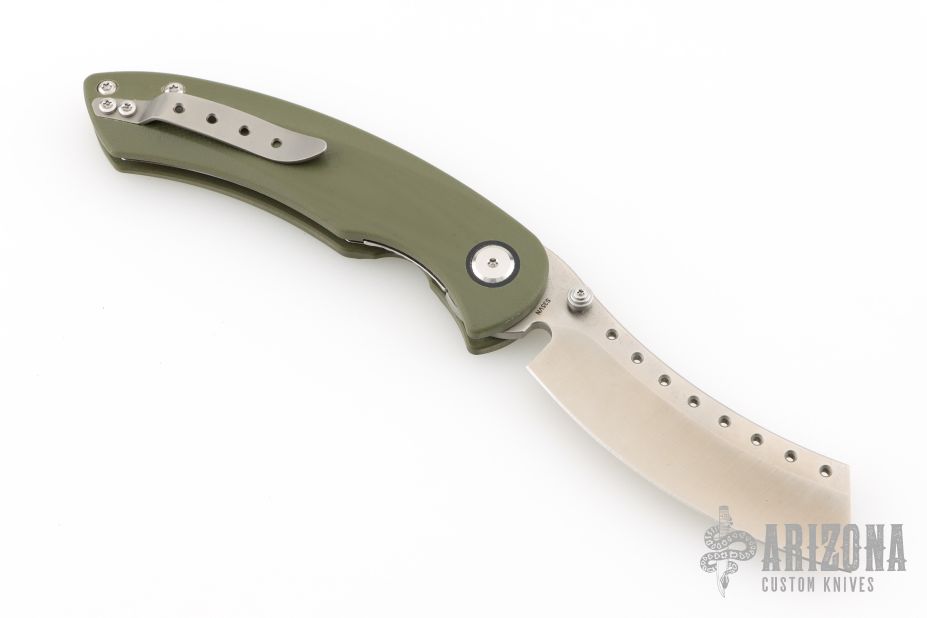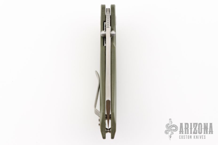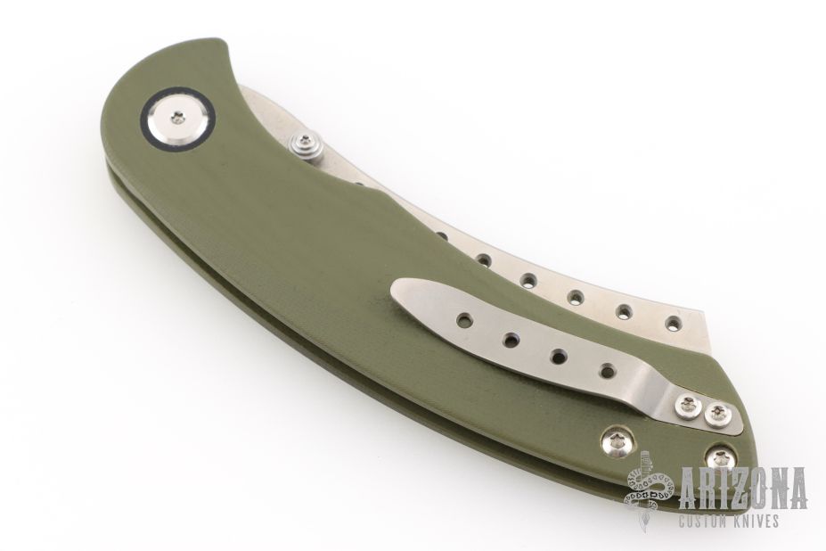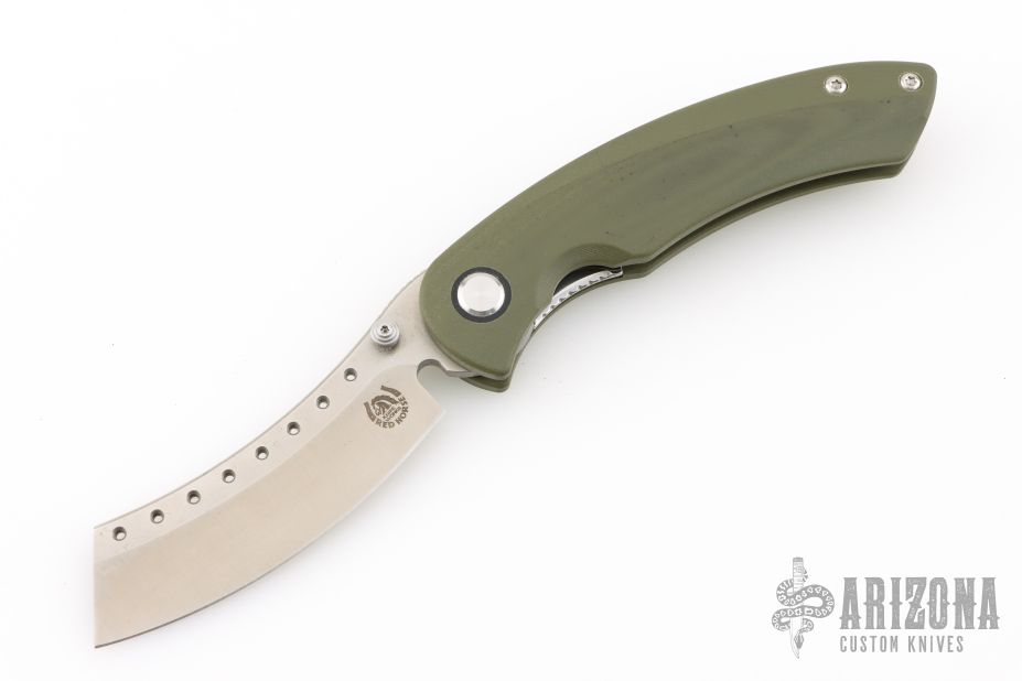 The Red Horse Knife Works Hell Razor P features a satin finished blade with dual thumbstuds and a notched thumbrest. The handle has green G-10 scales with black G-10 pivot collars, inlaid stainless steel liners, tip up bead blasted titanium clip. Comes with original box. Excellent condition.