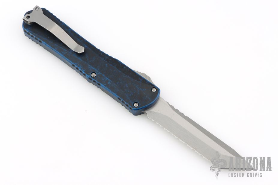 This Manticore-X by Heretic Knives features a stonewash finished tanto fully serrated blade. The handle has a breakthrough blue aluminum frame with blasted stainless steel hardware and tip down clip. Comes with original box and card. #01014. Excellent condition. 2019 Blade Show Special