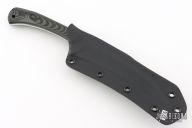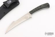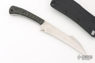 This knife by Mickey Yurco features a satin finished hawk bill blade with top edge, .172" blade thickness and 1.115" blade depth, full tang construction. The handle has black/green G10 scales with black pins and lanyard hole in pommel. Comes with a kydex sheath. #4694. New from maker at the 2025 Blade Show West!